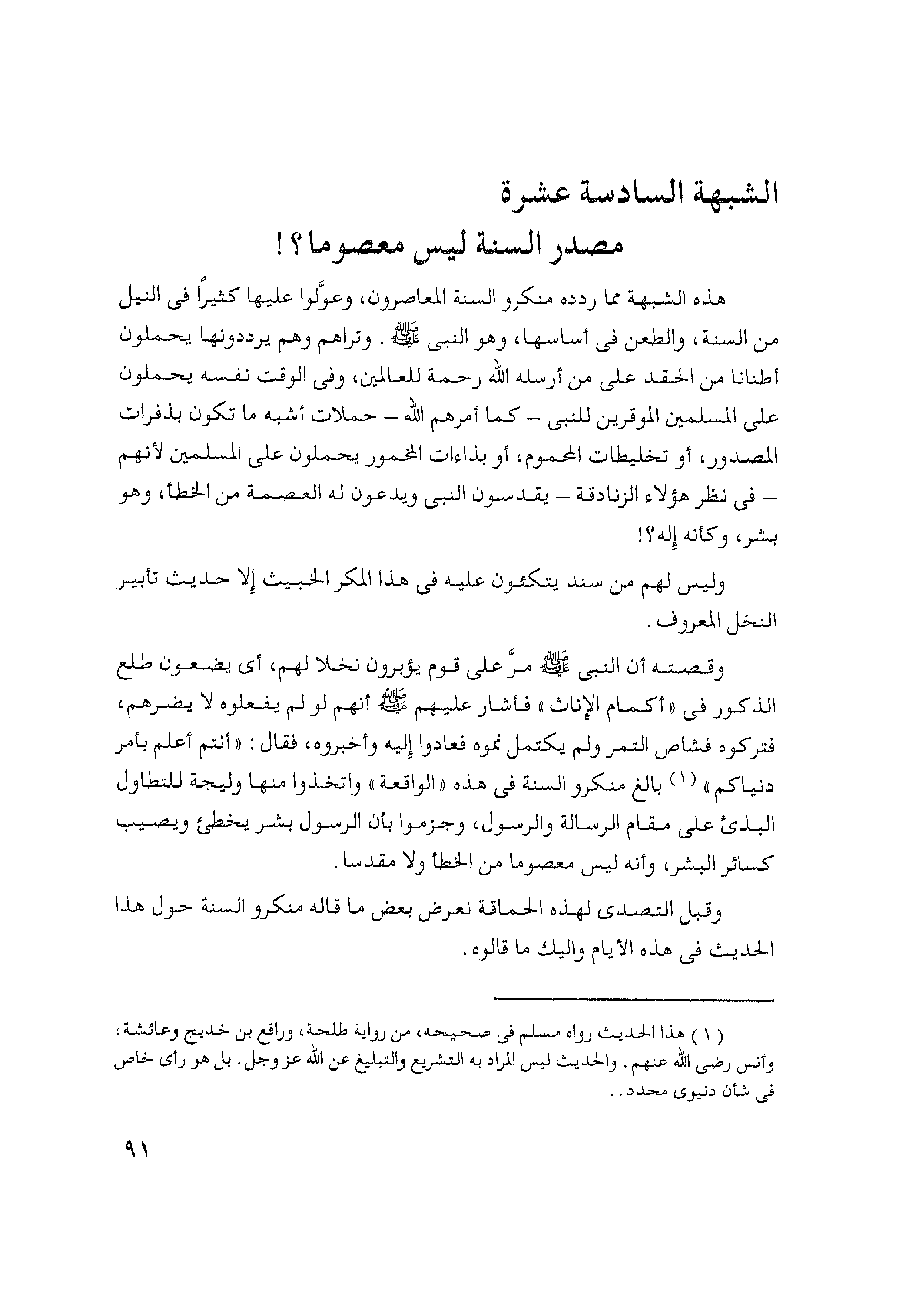 هذه الشبهة مما ردده منكرو السنة المعاصرون، وعوَّلوا عليها كثيراً في النيل من السنة، والطعن في أساسها، وهو النبي - صلى الله عليه وسلم -. وتراهم وهم يرددونها يحملون أطناناً من الحقد على من أرسله الله رحنة للعالمين، وفي الوقت نفسه يحملون على المسلمين الموقرين للنبي - كما أمرهم الله - حملات أشبه ما تكون بذفرات المصدور، أو تخليطات المحموم، أو بذاءات المخمور يحملون على المسلمين لأنهم - في نظر هؤلاء الزنادقة - يقدسون النبي ويدعون له العصمة من الخطأ، وهو بشر، وكأنه إله؟!