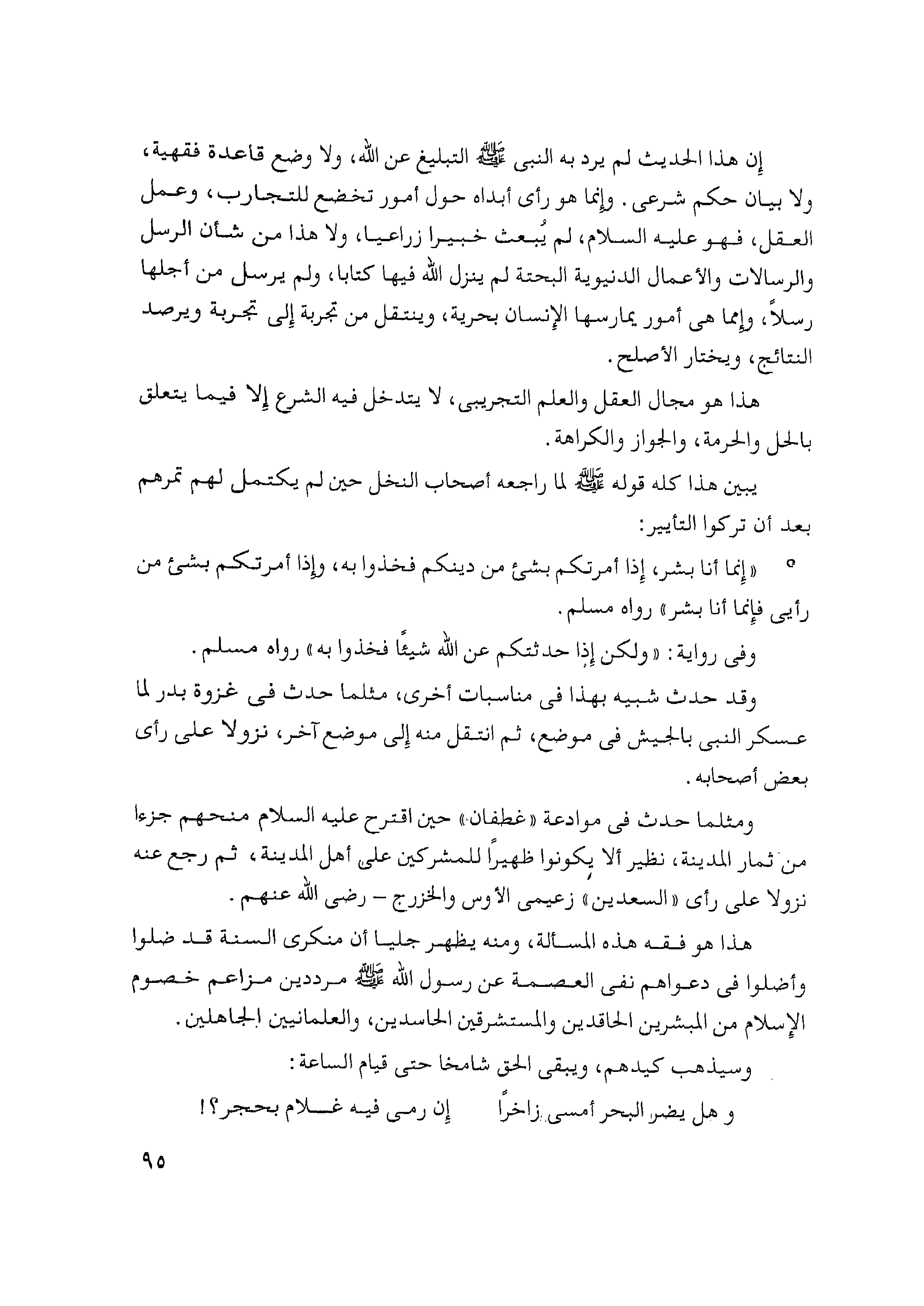 إن هذا الحديث لم يرد به النبي - صلى الله عليه وسلم - التبليغ عن الله، ولا وضع قاعدة فقهية، ولا بيان حكم شرعي، وإنما هو رأي أبداه حول أمور تخضع للتجارب، وعمل العقل، فهو عليه السلام، لم يُبعث خبيراً زراعياً، ولا هذا من شأن الرسل والرسالات والأعمال الدنيوية البحتة لم ينزل الله فيها كتاباً، ولم يرسل من أجلها رسلاً، وإمما هي أمور يمارسها الإنسان بحرية، وينتقل من تجربة إلى تجربة ويرصد النتائج، ويختار الأصلح.