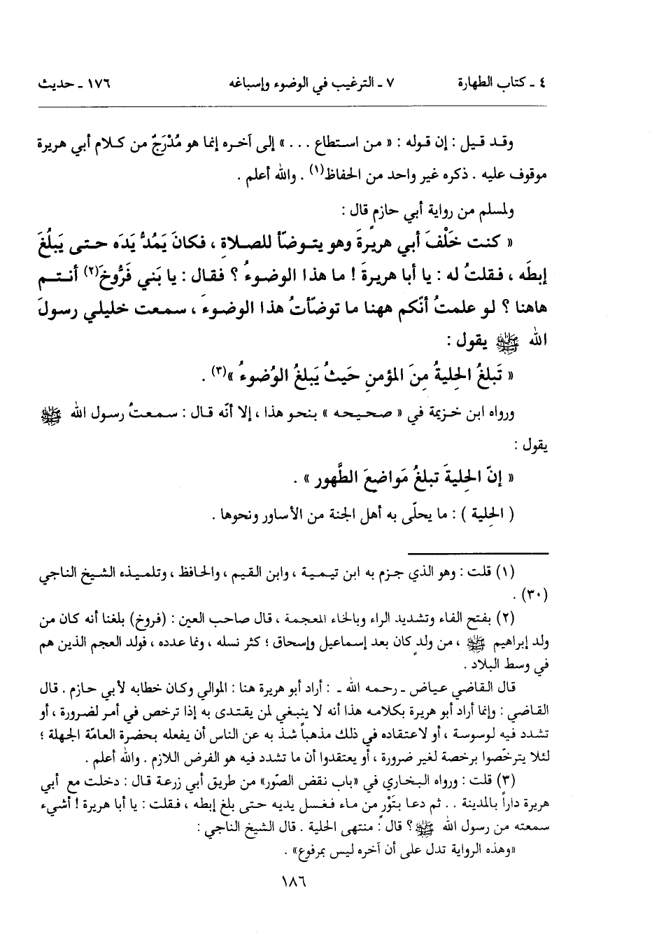 (¬3) قلت: ورواه البخاري في "باب نقض الصّور" من طريق أبي زرعة قال: دخلت مع أبي هريرة داراً بالمدينة. . ثم دعا بتَوْرٍ من ماء فغسل يديه حتى بلغ إبطه، فقلت: يا أبا هريرة! أشيء سمعته من رسول الله - صَلَّى اللهُ عَلَيْهِ وَسَلَّمَ - قال: منتهى الحلية. قال الشيخ الناجي: