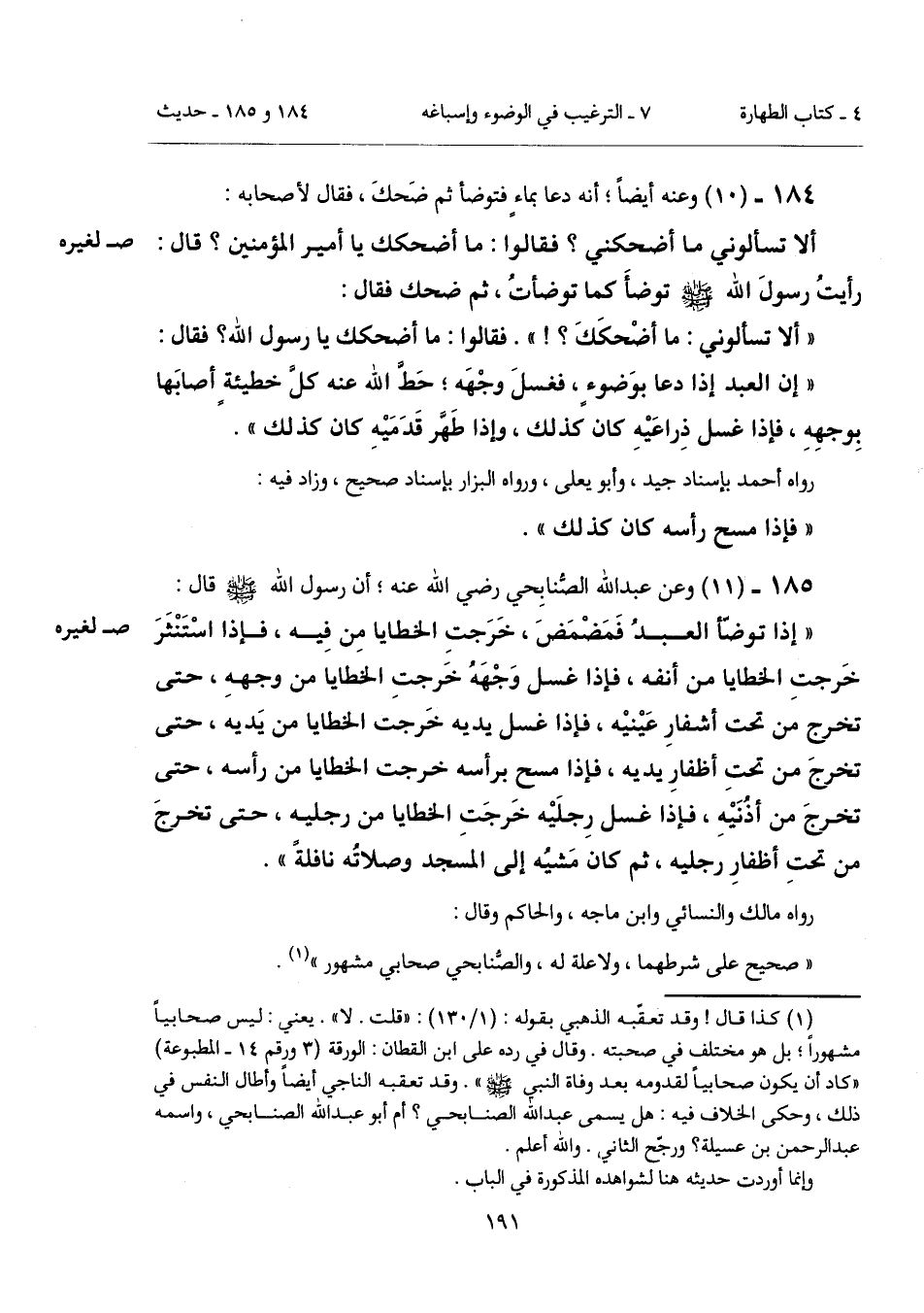 185 - (11) [صحيح لغيره] وعن عبد الله الصُّنابِحي رضي الله عنه؛ أن رسول الله - صَلَّى اللهُ عَلَيْهِ وَسَلَّمَ - قال: