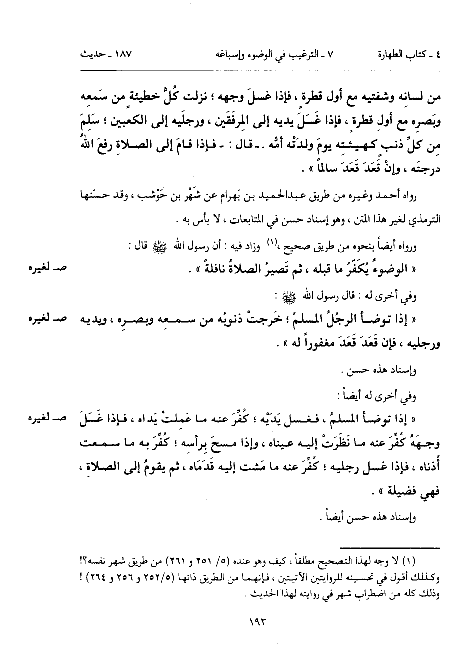 (¬1) لا وجه لهذا التصحيح مطلقاً، كيف وهو عنده (5/ 251 و261) من طريق شهر نفسه؟! وكذلك أقول في تحسينه للروايتين الآتيتين، فإنهما من الطريق ذاتها (5/ 252 و256 و264)! وذلك كله من اضطراب شهر في روايته لهذا الحديث.