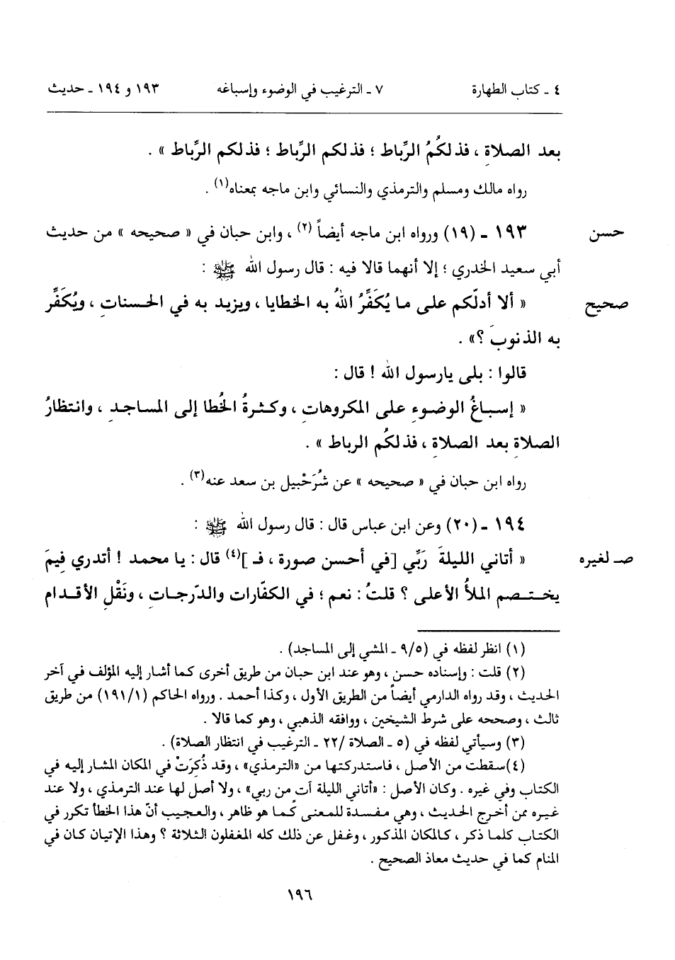 "إسباغُ الوضوءِ على المكروهاتِ، وكثرةُ الخُطا إلى المساجدِ، وانتظارُ