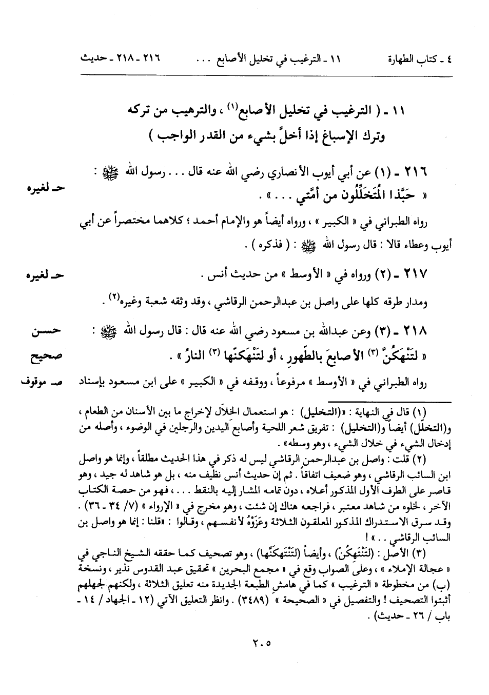 11 - (الترغيب في تخليل الأصابع (¬1)، والترهيب من تركه وترك الإسباغ إذا أخلَّ بشيء من القدر الواجب)