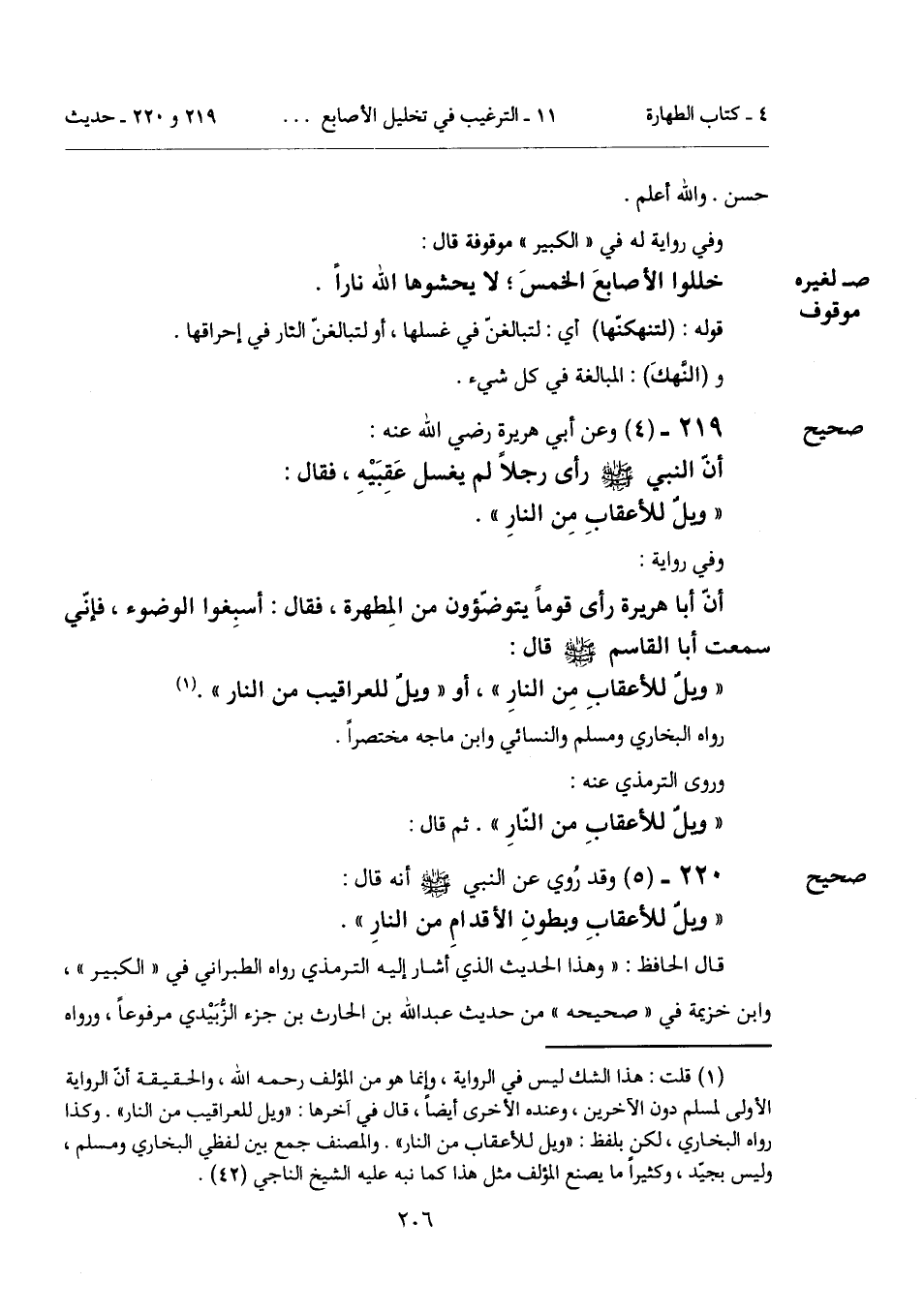 (¬1) قلت: هذا الشك ليس في الرواية، وإنما هو من المؤلف رحمه الله، والحقيقة أنّ الرواية الأولى لمسلم دون الآخرين، وعنده الأخرى أيضاً، قال في آخرها: "ويل للعراقيب من النار". وكذا رواه البخاري، لكن بلفظ: "ويل للأعقاب من النار". والمصنف جمع بين لفظي البخاري ومسلم، وليس بجيّد، وكثيراً ما يصنع المؤلف مثل هذا كما نبه عليه الشيخ الناجي (42).
