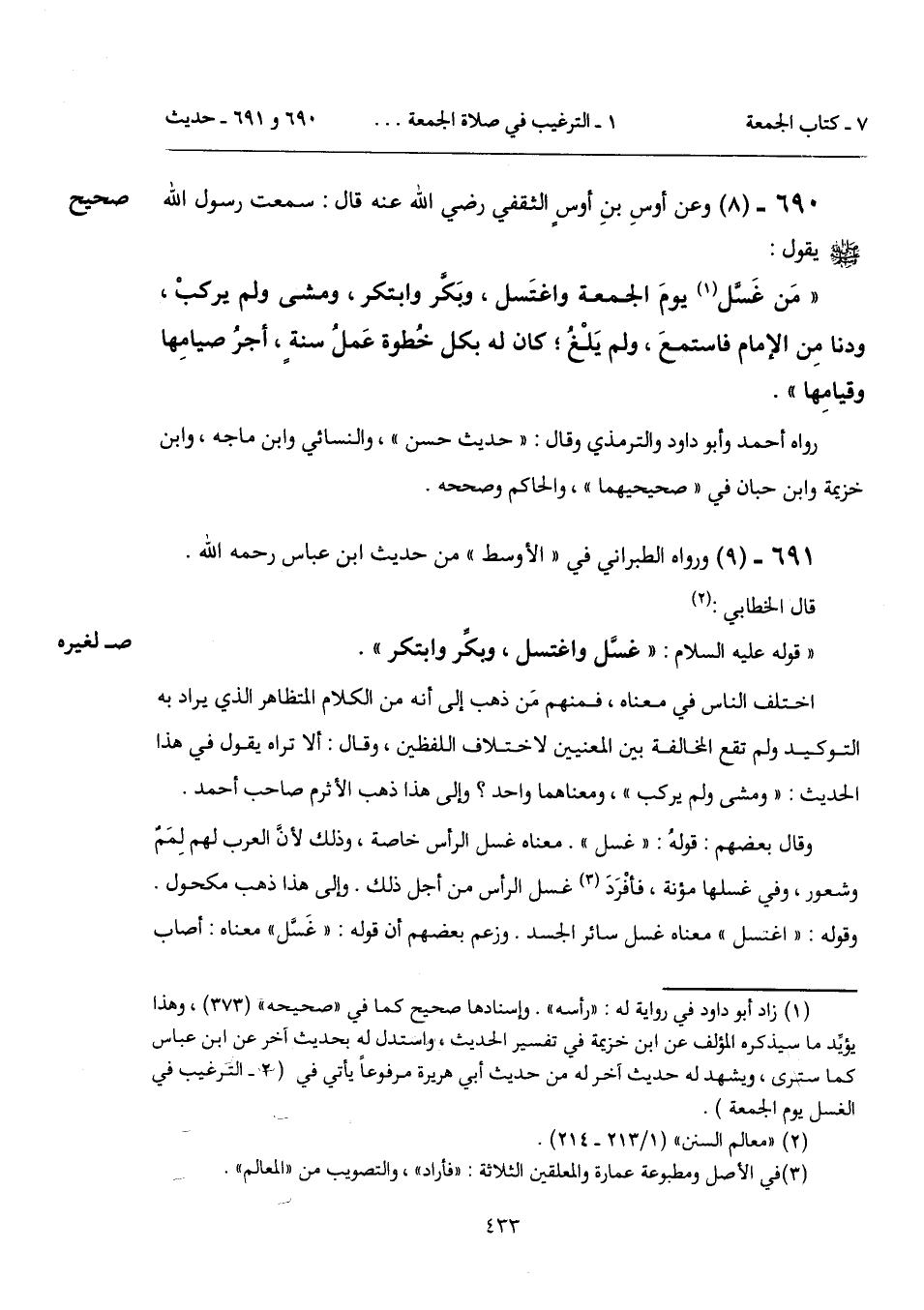 (¬1) زاد أبو داود في رواية له: "رأسه". وإسنادها صحيح كما في "صحيحه" (373)، وهذا يؤيِّد ما سيذكره المؤلف عن ابن خزيمة في تفسير الحديث، واستدل له بحديث آخر عن ابن عباس كما سترى، ويشهد له حديث آخر له من حديث أبي هريرة مرفوعاً يأتي في (2 - التغيب في الغسل يوم الجمعة).