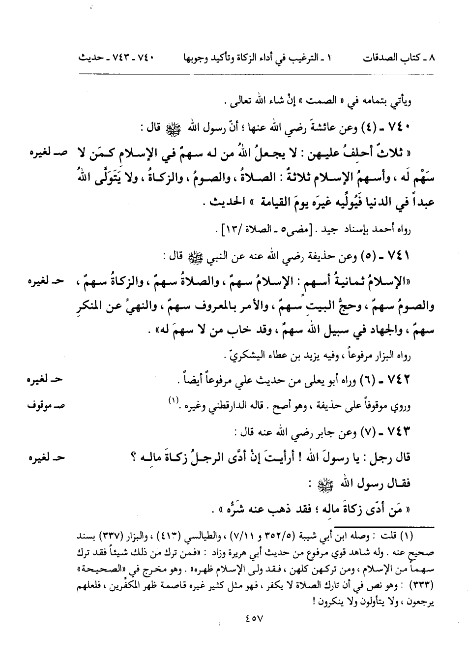 "ثلاثٌ أحلِفُ عليهن: لا يجعلُ الله من له سهمٌ في الإسلامِ كمَن لا سَهْم لَه، وأسهمُ الإسلام ثلاثةٌ: الصلاةُ، والصومُ، والزكاةُ، ولا يَتَوَلَّى اللهُ عبداً في الدنيا فَيُولِّيه غيرَه يومَ القيامة" الحديث.