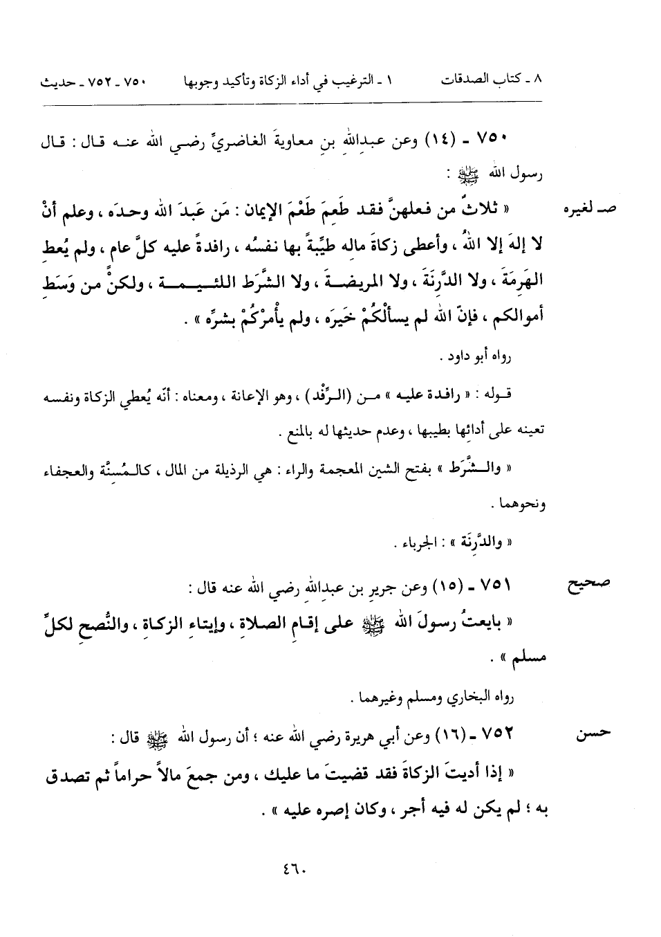 "ثلاثٌ من فعلهنَّ فقد طَعِمَ طَعْمَ الإيمان: مَن عَبدَ الله وحدَه، وعلم أنْ لا إلهَ إلا اللهُ، وأعطى زكاةَ مالِه طيِّبةً بها نفسُه، رافدةً عليه كلَّ عامٍ، ولم يُعطِ الهَرِمَةَ، ولا الدَّرِنَةَ، ولا المريضةَ، ولا الشَّرَط اللئيمة، ولكنْ من وَسَطِ أموالكم، فإنّ الله لم يسألْكمْ خَيرَه، ولم يأْمرْكُمْ بشرِّه".