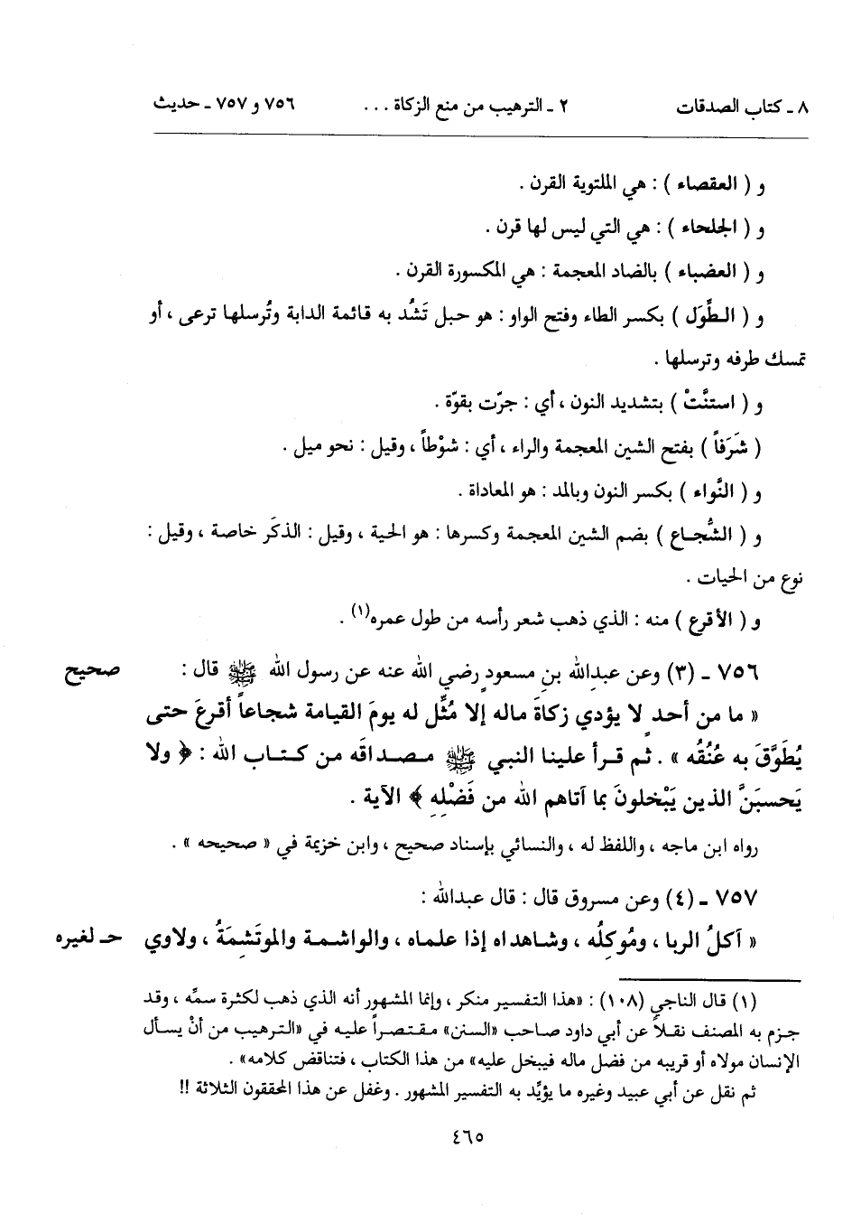 (¬1) قال الناجي (108): "هذا التفسير منكر، وإنما المشهور أنه الذي ذهب لكثرة سمِّه، وقد جزم به المصنف نقلاً عن أبي داود صاحب "السنن" مقتصراً عليه في "الترهيب من أنْ يسأل الإنسان مولاه أو قريبه من فضل مال فيبخل عليه" من هذا الكتاب، فتناقض كلامه".