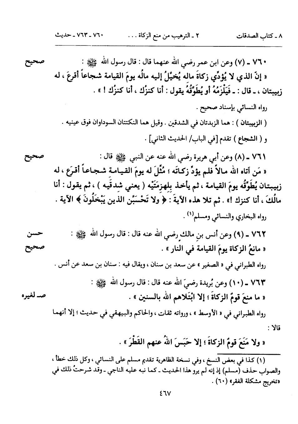 "مَن آتاه الله مالاً فلم يؤدِّ زكاتَه؛ مُثِّلَ له يومَ القيامةِ شجاعاً أقرَع، له زبيبتان يُطَوِّقُه يومَ القيامة، ثم يأخذ بلِهزِمَتَيْه (يعني شِدقَيه)، ثم يقول: أنا مالُكَ، أنا كنزك! ". ثم تلا هذه الآيةَ {وَلَا يَحْسَبَنَّ الَّذِينَ يَبْخَلُونَ} " الآية.