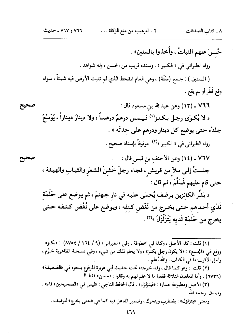 "بَشِّر الكانِزين برضفٍ يُحمَى عليه في نارِ جهنمَ، ثم يوضع على حَلَمَةِ ثَدْيِ أحدِهم حتى يخرج من نُغْضِ كتِفِه، ويوضع على نُغْض كتفه حتى يخرج من حَلَمَةِ ثَديِه يَتَزَلْزَلُ" (¬3).