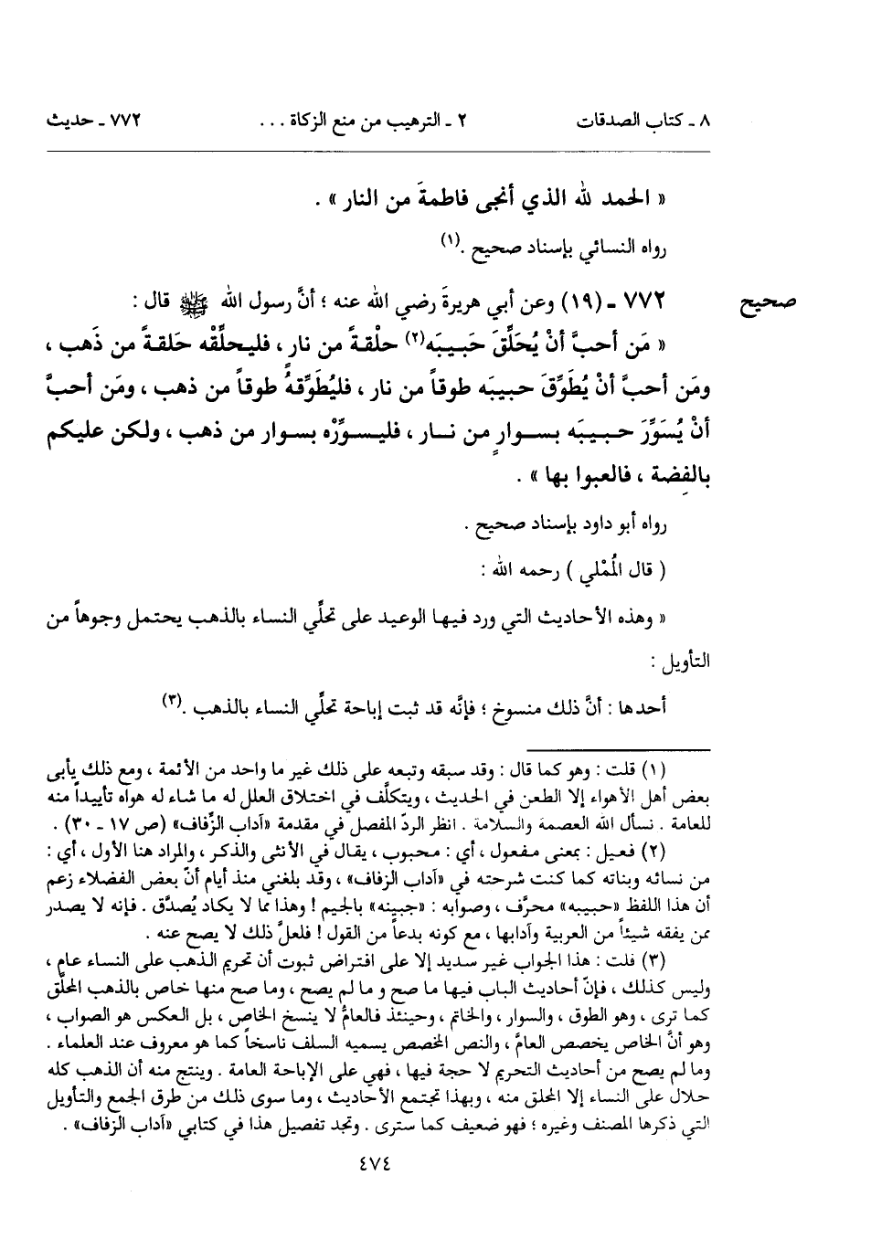 (¬3) قلت: هذا الجواب غير سديد إلا على افتراض ثبوت أن تحريم الذهب على النساء عام، وليس كذلك، فإنَّ أحاديث الباب فيها ما صح وما لم يصح، وما صح منها خاص بالذهب المحلَّق كما ترى، وهو الطوق، والسوار، والخاتم، وحينئذ فالعامُّ لا ينسخ الخاص، بل العكس هو الصواب، وهو أنَّ الخاص يخصص العامّ، والنص المخصص يسميه السلف ناسخاً كما هو معروف عند العلماء. وما لم يصح من أحاديث التحريم لا حجة فيها، فهي على الإباحة العامة. وينتج منه أن الذهب كله حلال على النساء إلا المحلق منه، وبهذا تجتمع الأحاديث، وما سوى ذلك من طرق الجمع والتأويل التي ذكرها المصنف وغيره؛ فهو ضعيف كما سترى. وتجد تفصيل هذا في كتابي "آداب الزفاف".