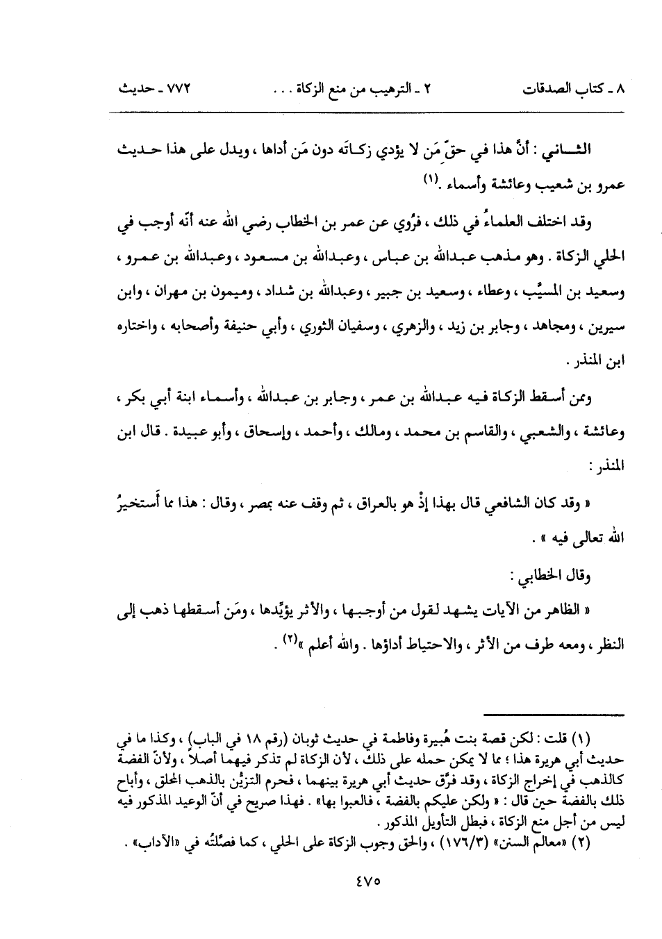 (¬2) "معالم السنن" (3/ 176)، والحق وجوب الزكاة على الحلي، كما فصَّلتُه في "الآداب".