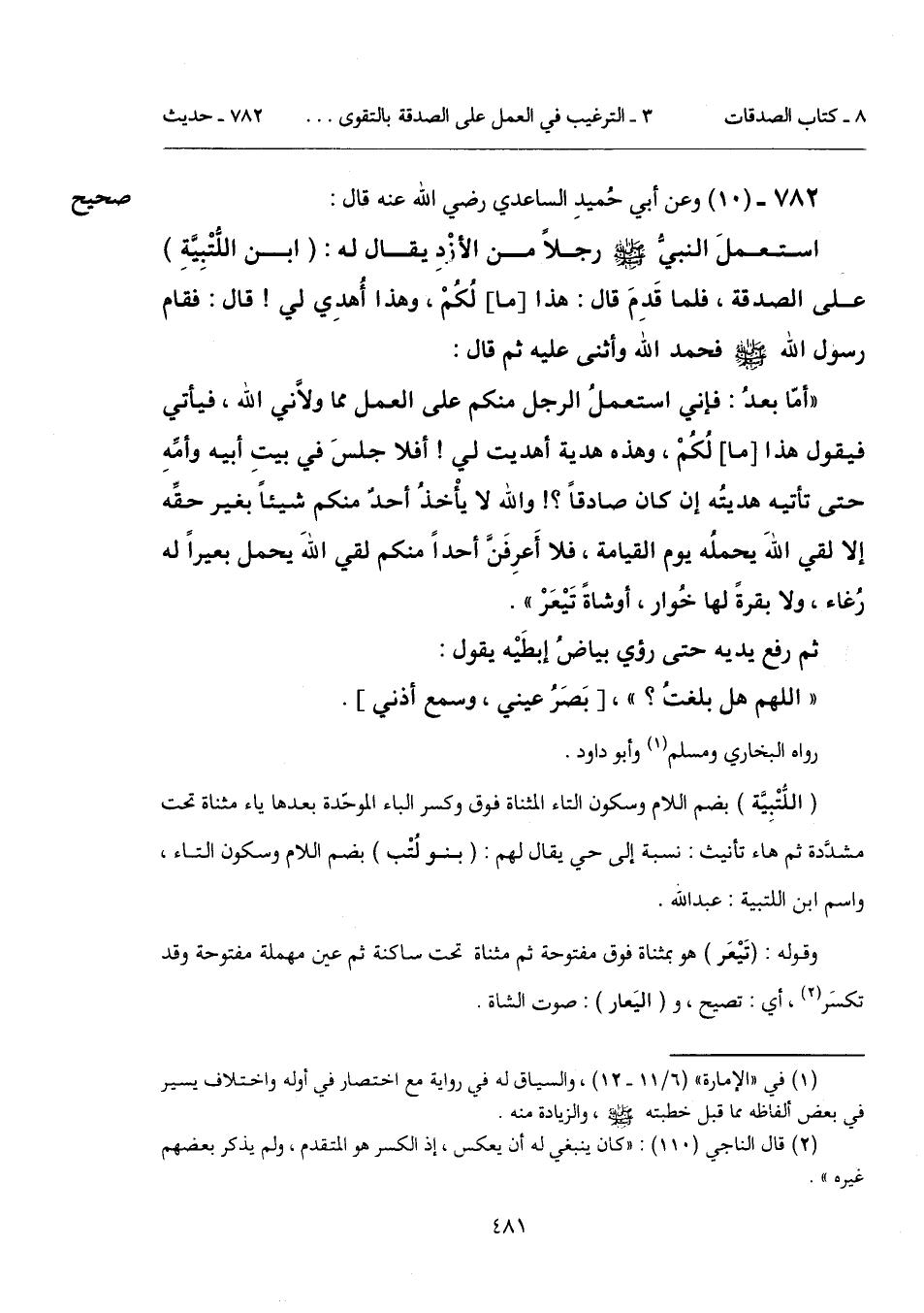 782 - (10) [صحيح] وعن أبي حُميدِ الساعدي رضي الله عنه قال: