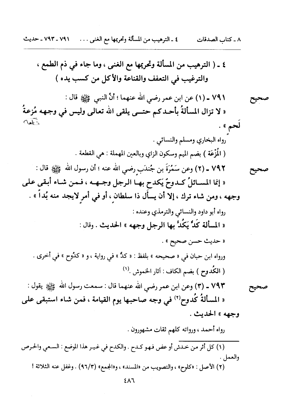 "إنما المسائلُ كدوحٌ يَكدح بها الرجل وجهه، فمن شاء أبقى على وجهه، ومن شاء ترك، إلا أن يسأَل ذا سلطانٍ، أو في أمرٍ لا يجد منه بُداً".