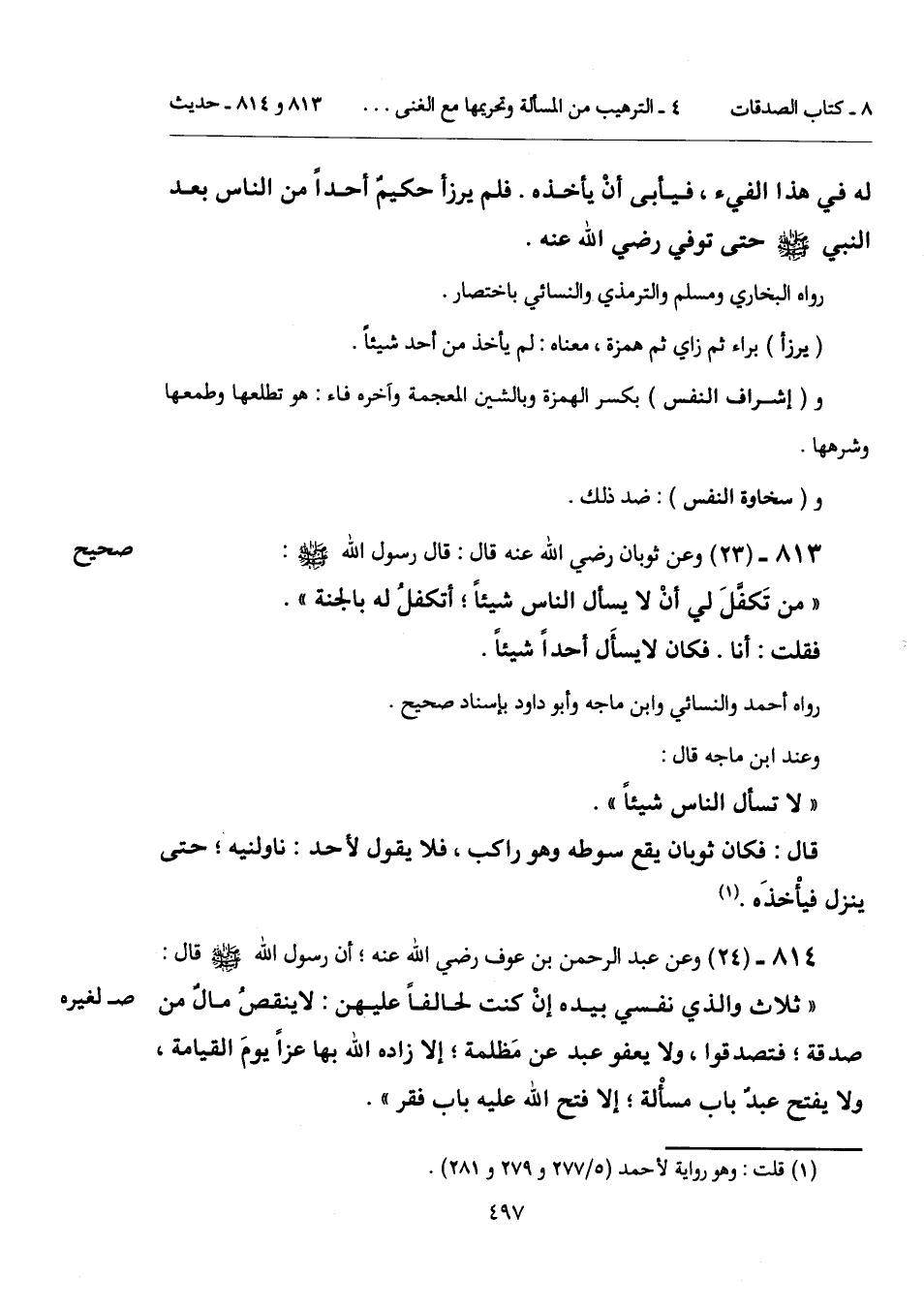 813 - (23) [صحيح] وعن ثوبان رضي الله عنه قال: قال رسول الله - صَلَّى اللهُ عَلَيْهِ وَسَلَّمَ -: