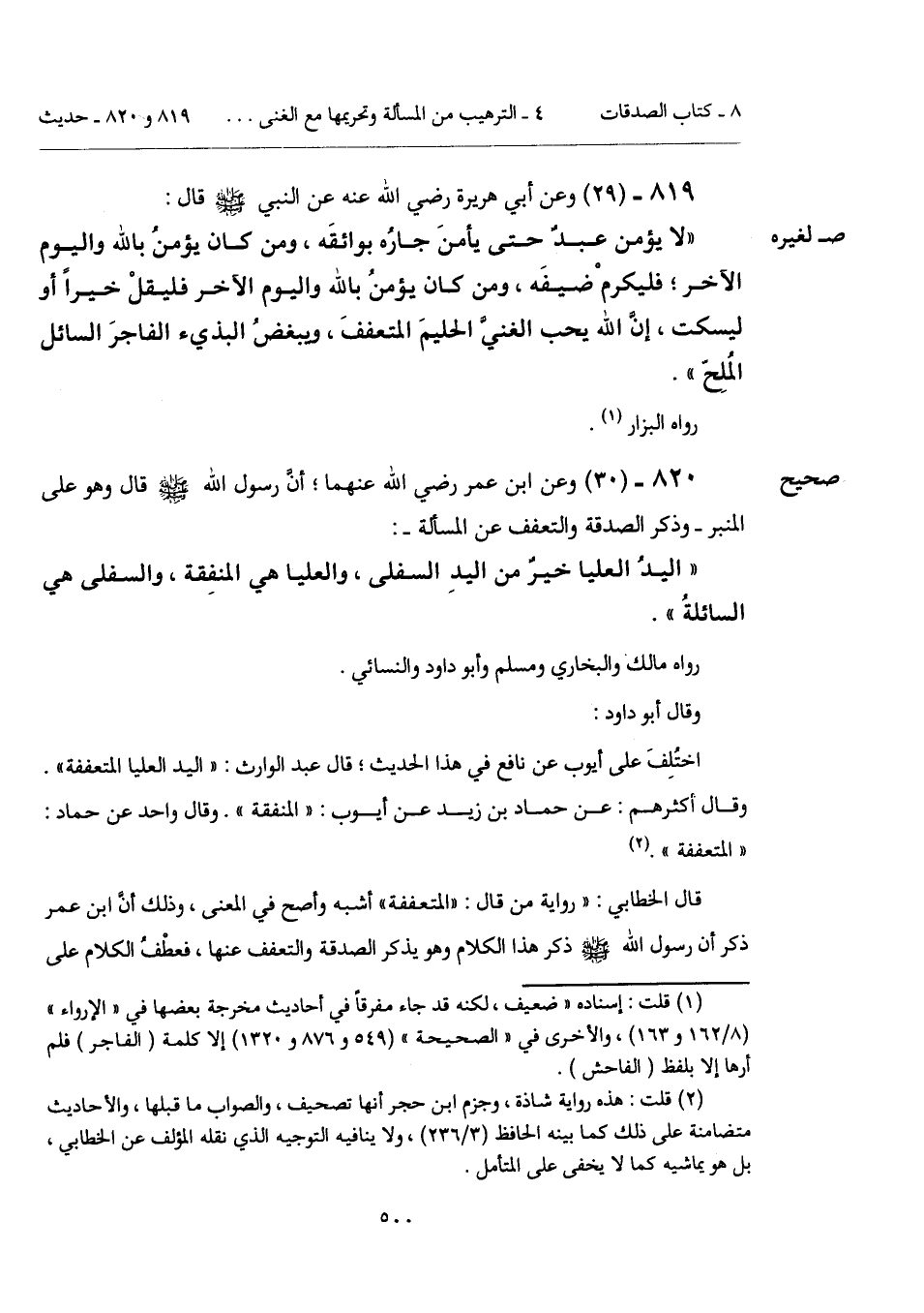 820 - (30) [صحيح] وعن ابن عمر رضي الله عنهما؛ أنَّ رسول الله - صَلَّى اللهُ عَلَيْهِ وَسَلَّمَ - قال وهو على المنبر -وذكر الصدقة والتعفف عن المسألة-: