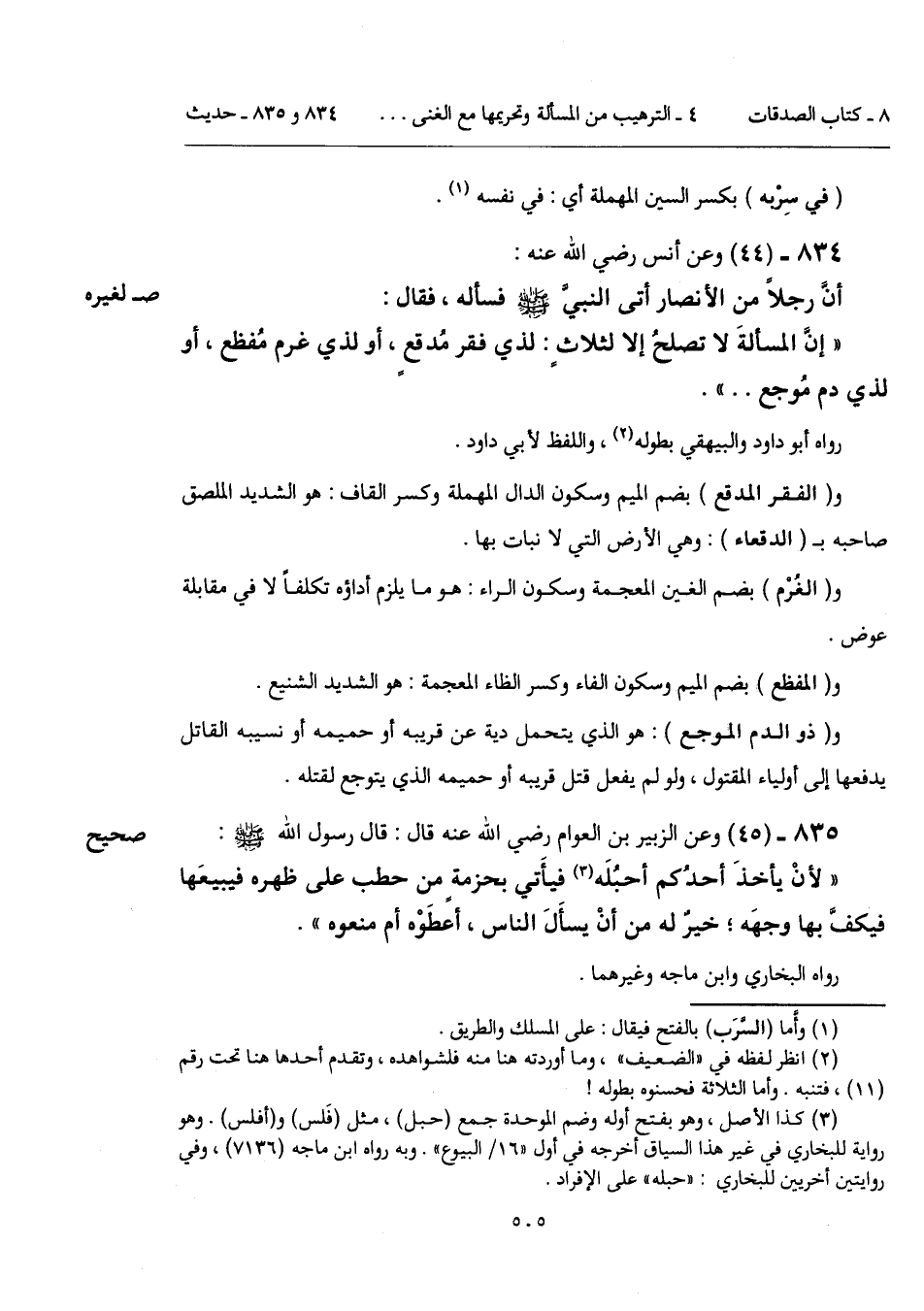 "إنَّ المسألةَ لا تصلحُ إلا لثلاثٍ: لذي فقر مُدقعٍ، أو لذي غرم مُفظع، أو لذي دم مُوجع. . ".