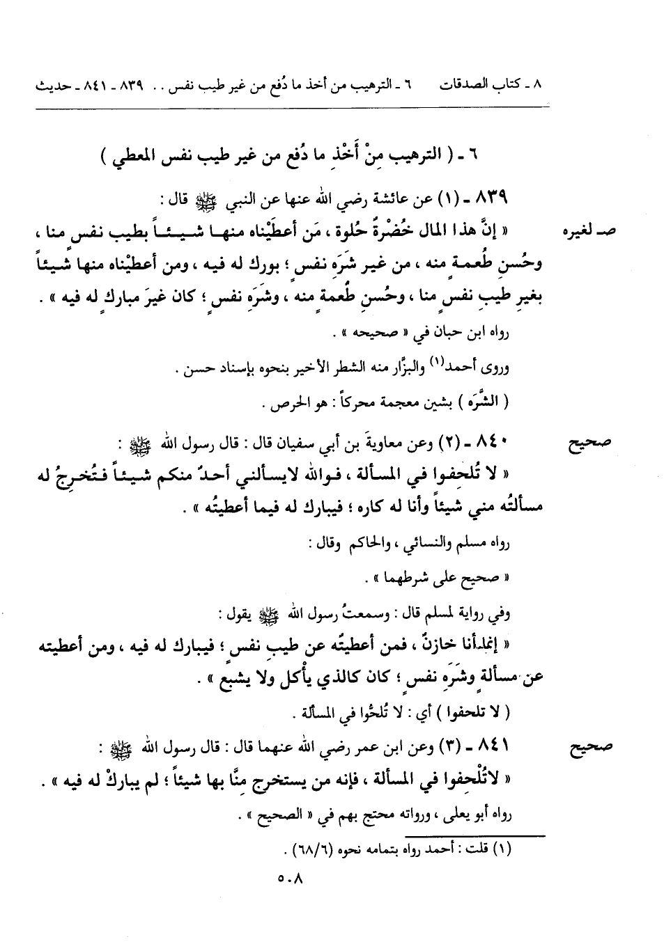 "إنَّ هذا المال خُضْرةٌ حُلوِة، مَن أعطَيْناه منها شيئاً بطيب نفسٍ منا، وحُسنِ طُعمةٍ منه، من غير شَرَهِ نفسٍ؛ بورِك له فيه، ومن أعطيْناه منها شيئاً بغيرِ طيبِ نفسٍ منا، وحُسنِ طعمةٍ منه، وشرَهِ نفسٍ؛ كان غيرَ مباركٍ له فيه".