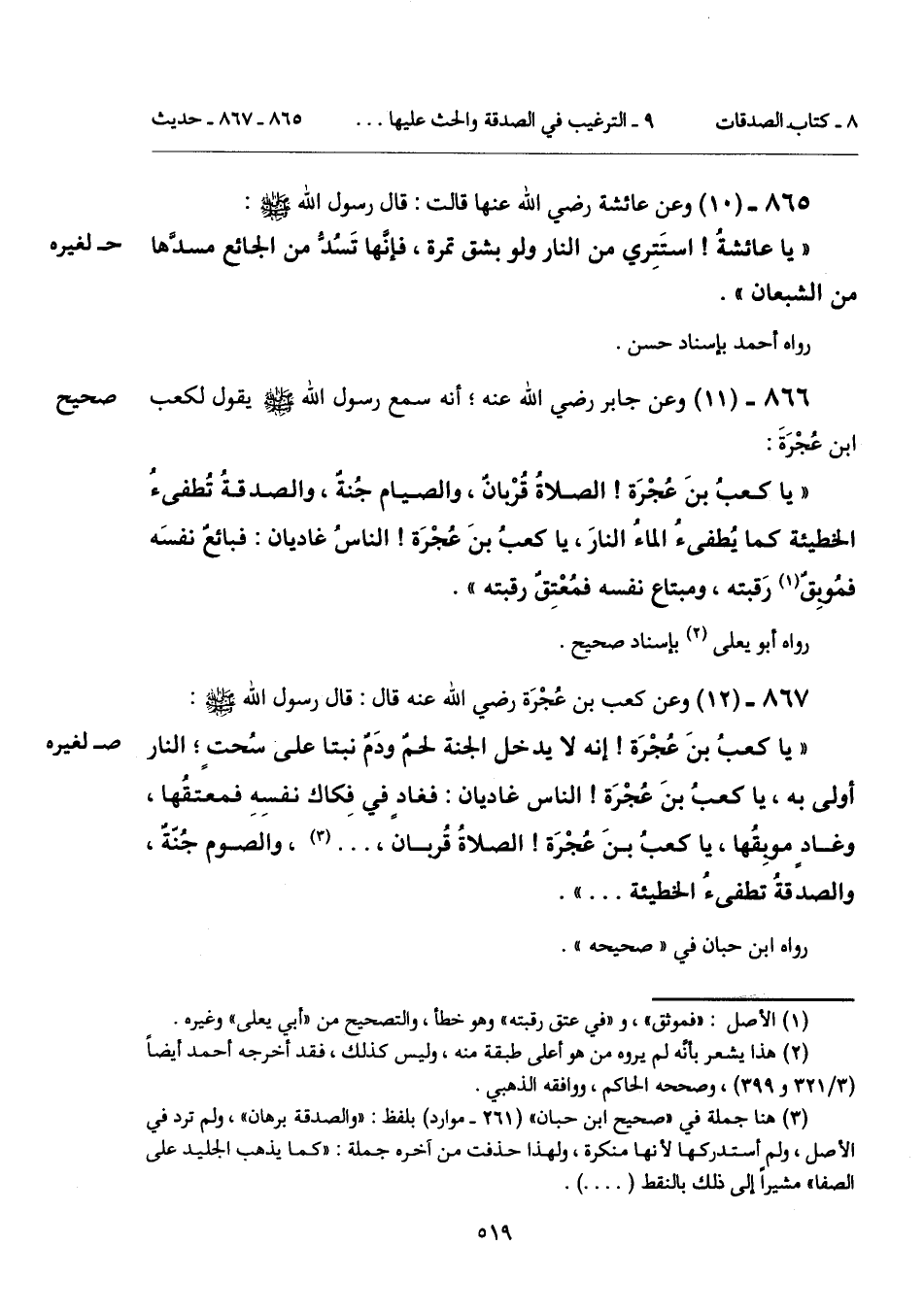 867 - (12) [صحيح لغيره] وعن كعب بن عُجْرَة رضي الله عنه قال: قال رسول الله - صَلَّى اللهُ عَلَيْهِ وَسَلَّمَ -: