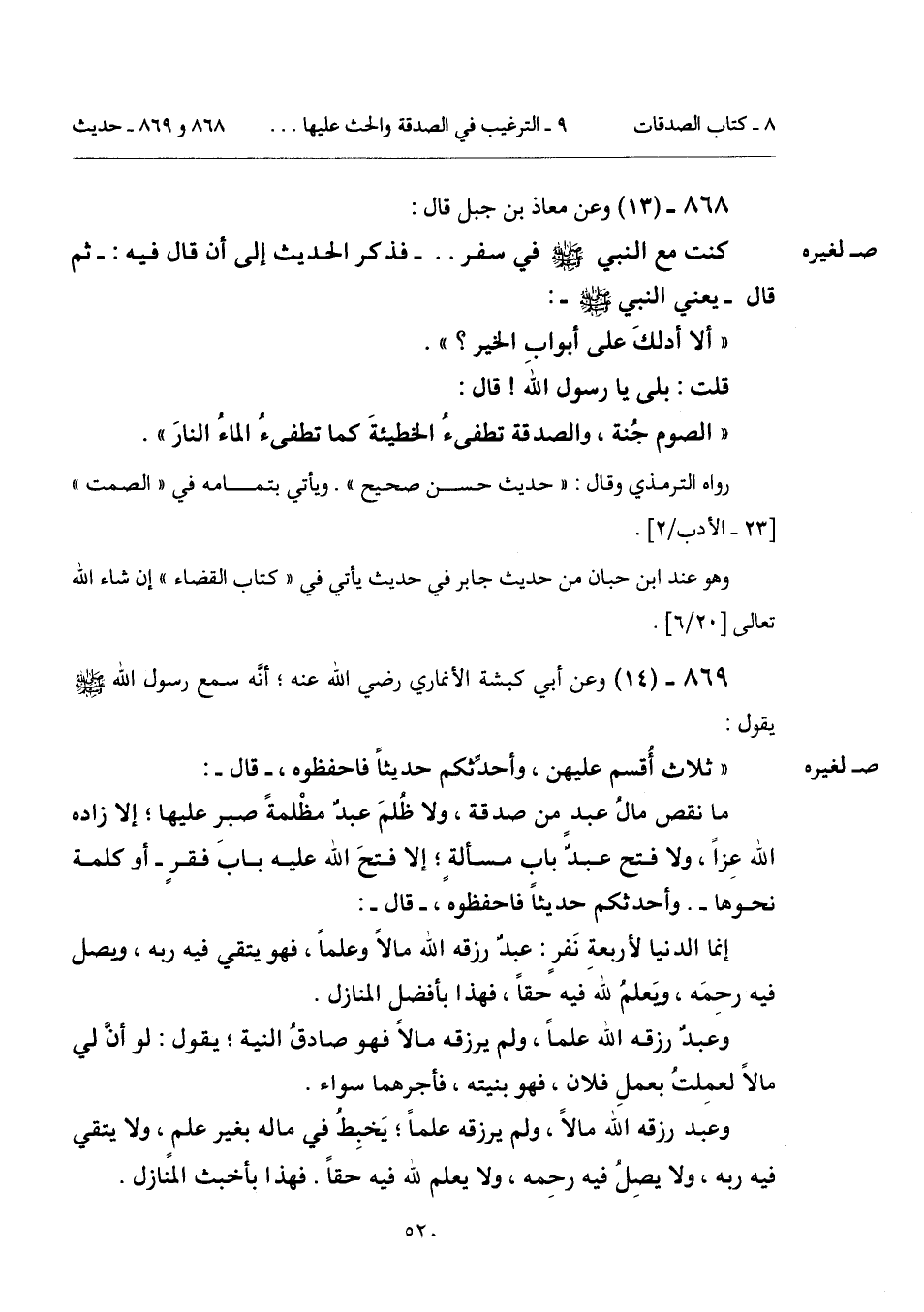 869 - (14) [صحيح لغيره] وعن أبي كبشة الأنماري رضي الله عنه؛ أنَّه سمع رسول الله - صَلَّى اللهُ عَلَيْهِ وَسَلَّمَ - يقول: