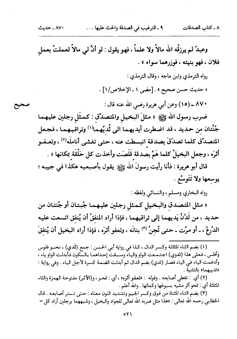 "مثل المتصدقِ والبخيلِ كمثلِ رجلين عليهما جُبتان أو جُنتان من حديد، من لَدُنْ يَديهما إلى تراقيهما، فإذا أراد المنفِقُ أن يُنفِق اتسعت عليه الدِّرعُ، -أو مرَّت- حتى تُجِنَّ (¬3) بنانَه، وتعفو أثرَه، فإذا أراد البخيل أن يُنفِقَ