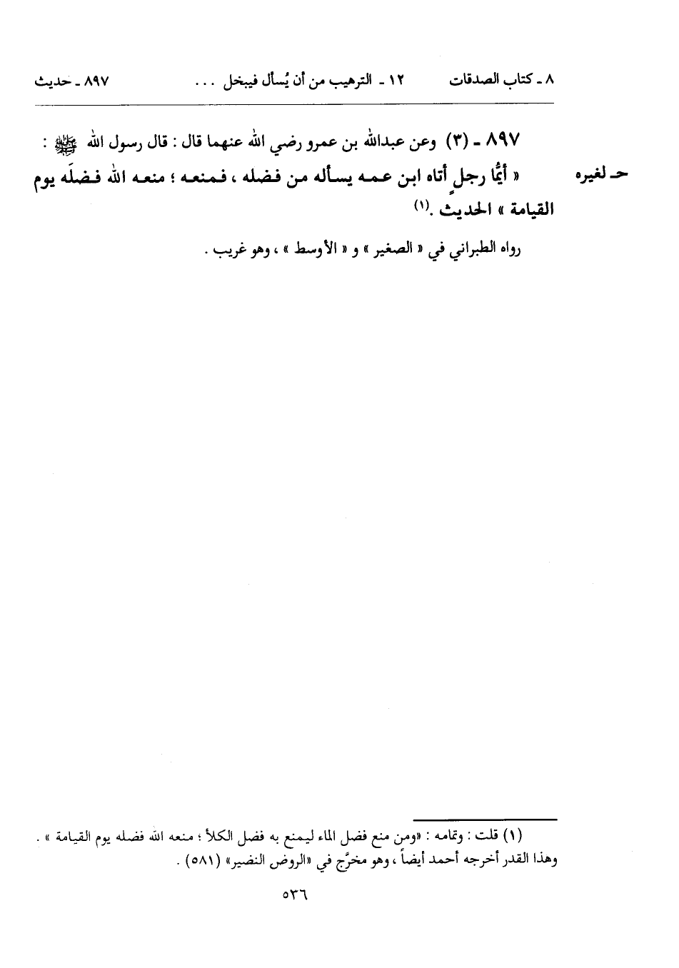 (¬1) قلت: وتمامه: "ومن منع فضل الماء ليمنع به فضل الكلأ؛ منعه الله فضله يوم القيامة".