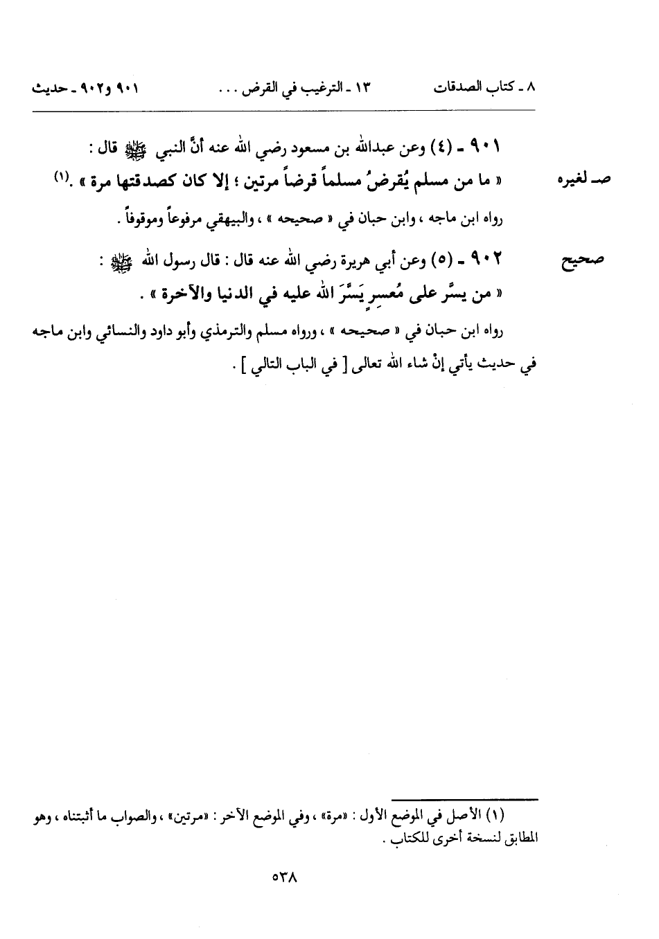 "ما من مسلم يُقرضُ مسلماً قرضاً مرتين؛ إلا كان كصدقتها مرة". (¬1)