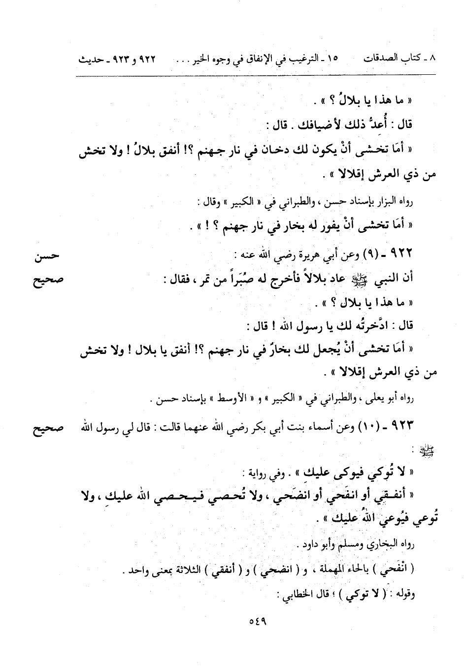 923 - (10) [صحيح] وعن أسماء بنت أبي بكر رضي الله عنهما قالت: قال لي رسول الله - صَلَّى اللهُ عَلَيْهِ وَسَلَّمَ -: