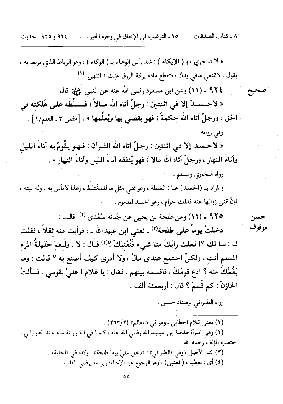 "لا حسدَ إلا في اثنتين: رجلٌ آتاه الله مالاً؛ فسلَّطَه على هَلَكَتِه في الحق، ورجلٌ آتاه الله حكمةً؛ فهو يقضي بها وُيعلِّمها". [مضى 3 - العلم/ 1]. وفي رواية: