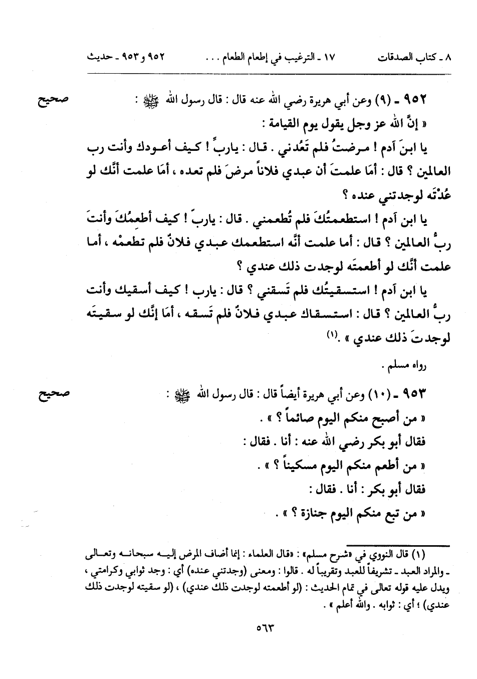 يا ابن آدم! استطعمتُكَ فلم تُطعمني. قال: يا ربّ! كيف أطعِمُكَ وأنتَ ربُّ العالمين؟ قال: أما علمت أنَّه استطعمك عبدي فلانٌ فلم تطعمْه، أما علمت أنَّك لو أطعمتَه لوجدت ذلك عندي؟