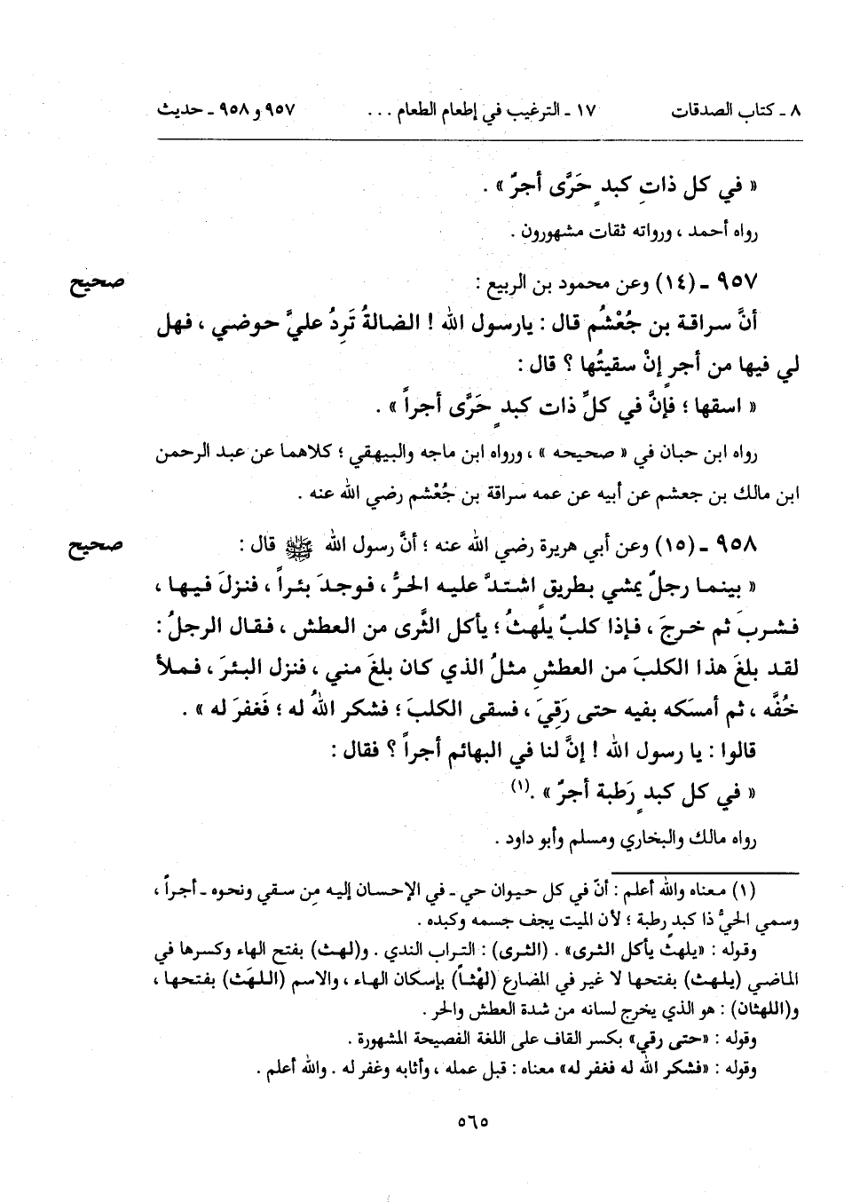 (¬1) معناه والله أعلم: أنّ في كل حيوان حي -في الإحسان إليه مِن سقي ونحواً- أجراً، وسمي الحيُّ كبدٍ رطبة؛ لأن الميت يجف جسمه وكبده.