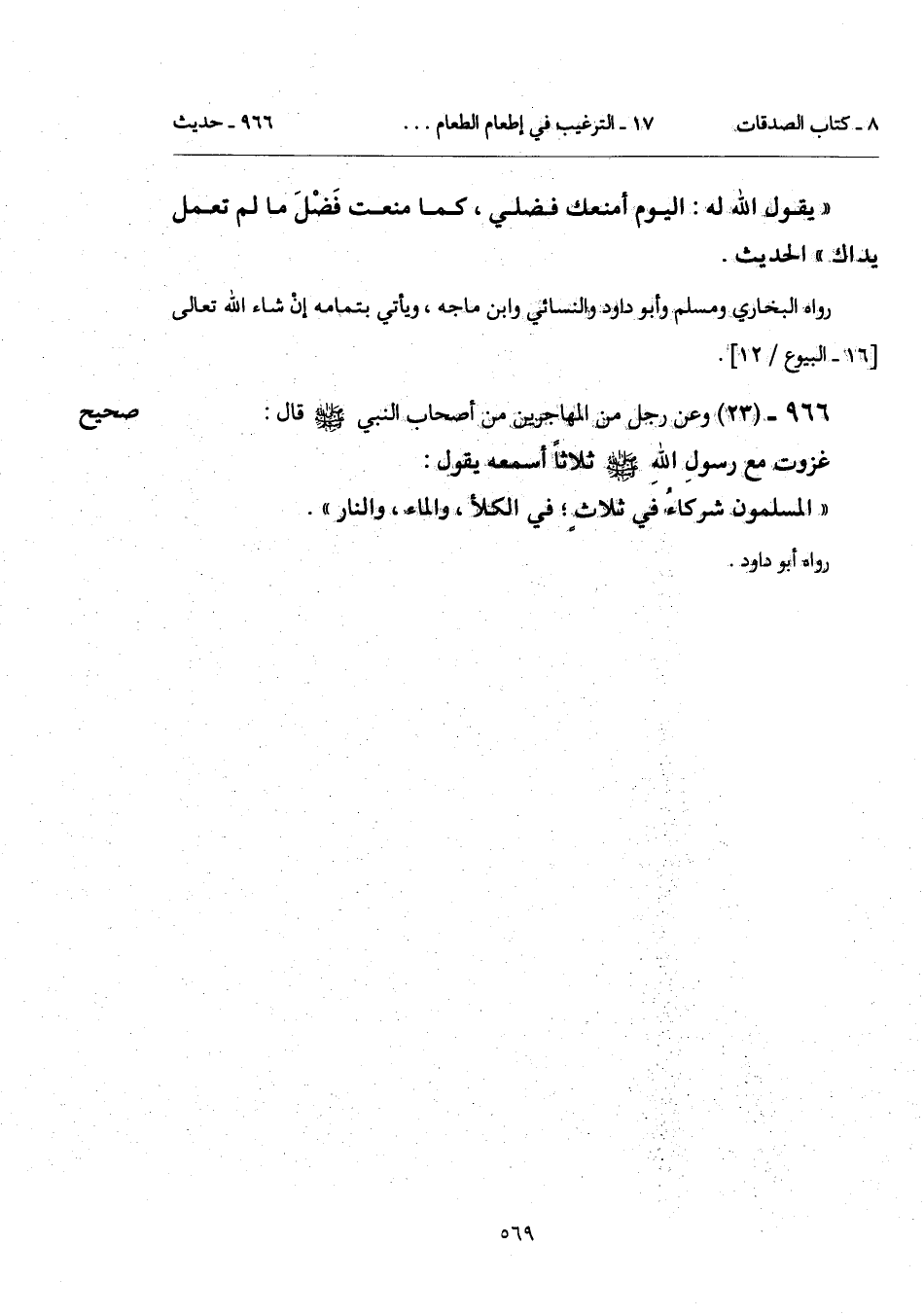 "المسلمون شركاءُ في ثلاثٍ؛ في الكلأ؛ والماء، والنار".