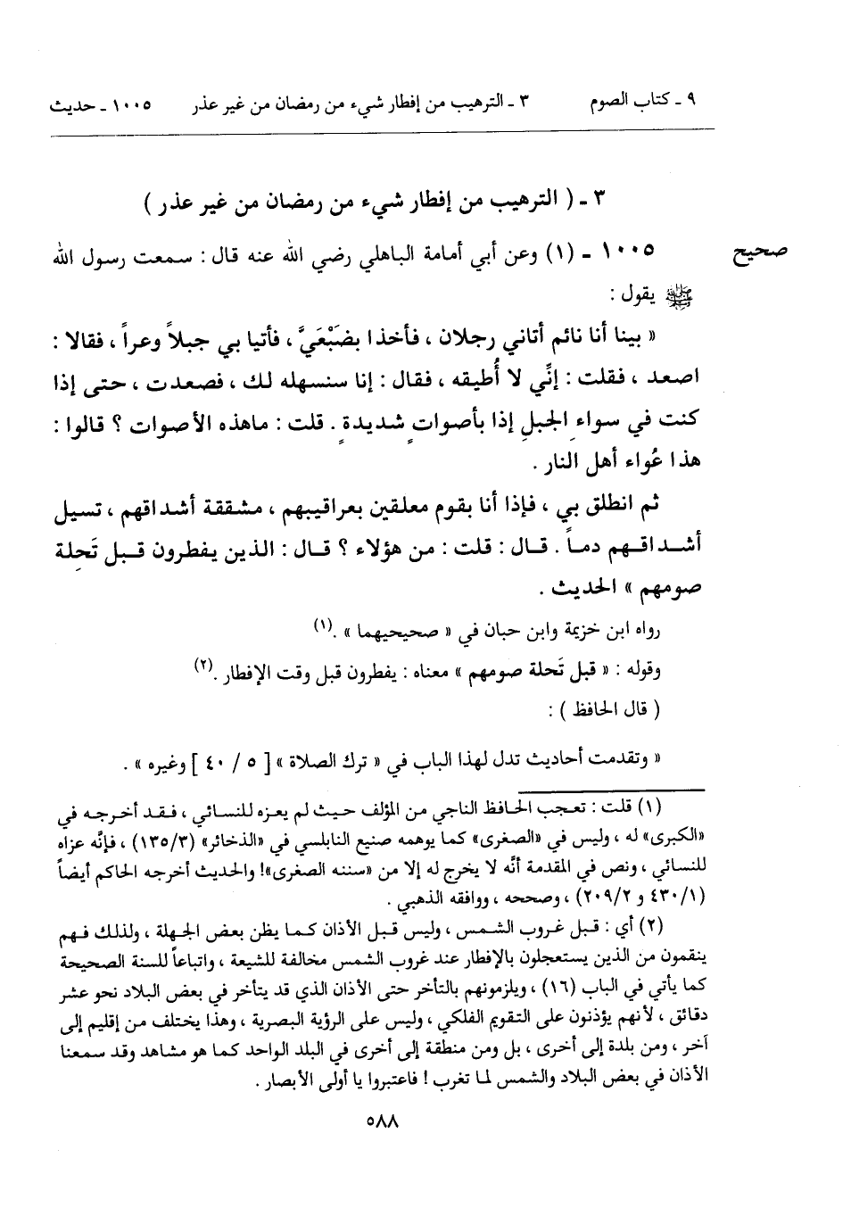 (¬2) أي: قبل غروب الشمس، وليس قبل الأذان كما يظن بعض الجهلة، ولذلك فهم ينقمون من الذين يستعجلون بالإفطار عند غروب الشمس مخالفة للشيعة، واتباعاً للسنة الصحيحة كما يأتي في الباب (16)، ويلزمونهم بالتأخر حتى الأذان الذي قد يتأخر في بعض البلاد نحو عشر دقائق، لأنهم يؤذنون على التقويم الفلكي، وليس على الرؤية البصرية، وهذا يختلف من إقليم إلى آخر، ومن بلدة إلى أخرى، بل ومن منطقة إلى أخرى في البلد الواحد كما هو مشاهد وقد سمعنا الأذان في بعض البلاد والشمس لما تغرب! فاعتبروا يا أولى الأبصار.