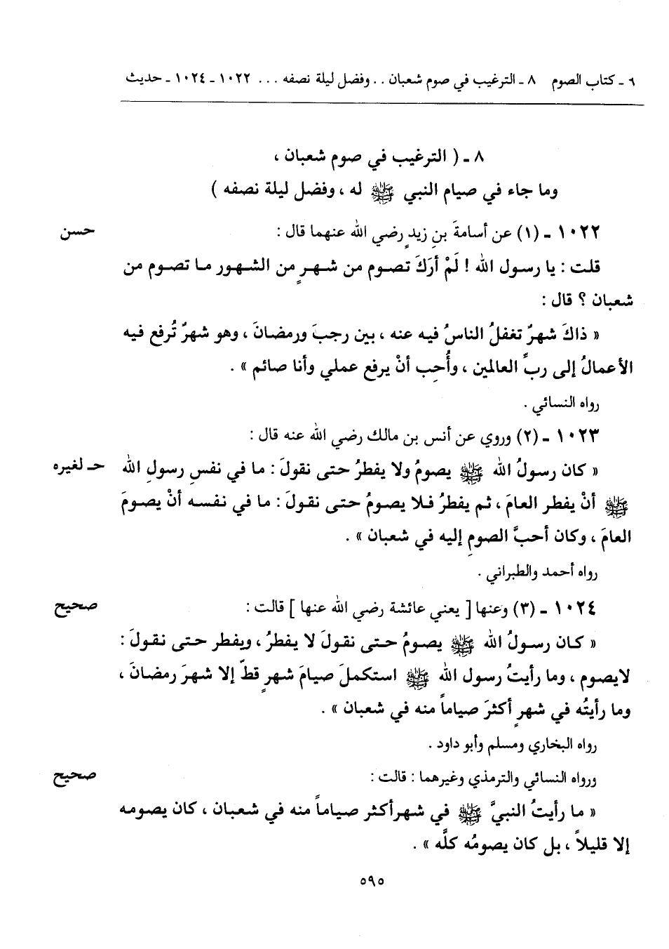 8 - (الترغيب في صوم شعبان، وما جاء في صيام النبي - صَلَّى اللهُ عَلَيْهِ وَسَلَّمَ - له، وفضل ليلة نصفه).