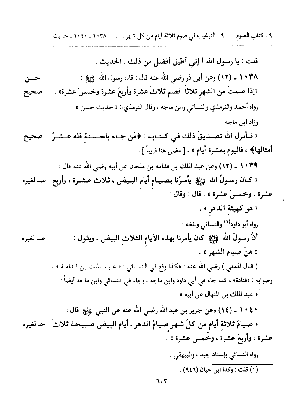 "صيامُ ثلاثةِ أيامٍ من كلّ شهر صيامُ الدهر، أيام البيض صبيحة ثلاثَ عشرة، وأربعَ عشرة، وخمس عشرة".