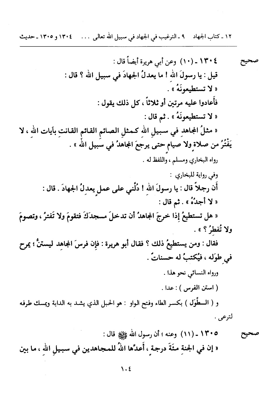 "مثلُ المجاهدِ في سبيلِ اللهِ كمثلِ الصائمِ القائم القانتِ بآيات اللهِ، لا يَفْتُرُ من صلاةٍ ولا صيامٍ حتى يرجعَ المجاهدُ في سبيل الله".