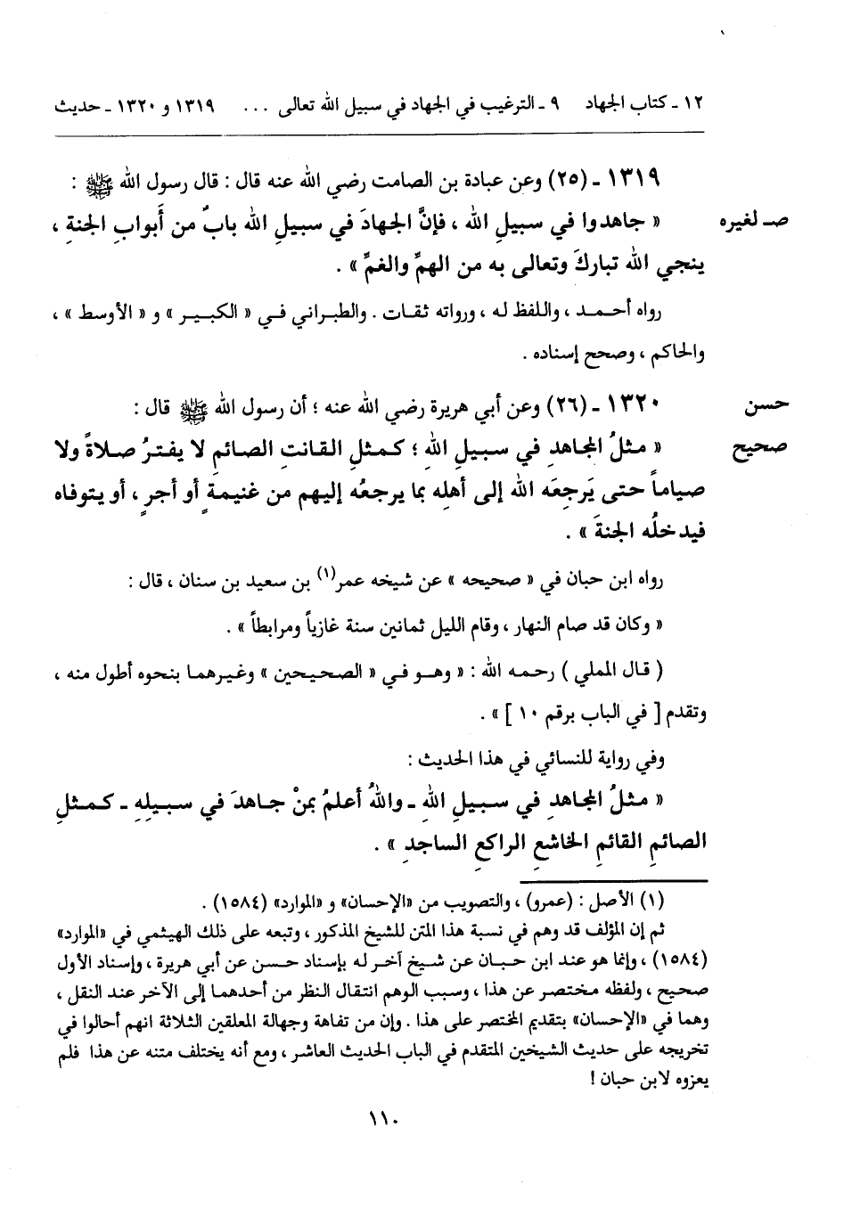 ثم إن المؤلف قد وهم في نسبة هذا المتن للشيخ المذكور، وتبعه على ذلك الهيثمي في "الموارد" (1584)، وإنما هو عند ابن حبان عن شيخ آخر له بإسناد حسن عن أبي هريرة، وإسناد الأول صحيح، ولفظه مختصر عن هذا، وسبب الوهم انتقال النظر من أحدهما إلى الآخر عند النقل، وهما في "الإحسان" بتقديم المختصر على هذا. وإن من تفاهة وجهالة المعلقين الثلاثة أنهم أحالوا في تخريجه على حديث الشيخين المتقدم في الباب الحديث العاشر، ومع أنه يختلف متنه عن هذا فلم يعزوه لابن حبان!