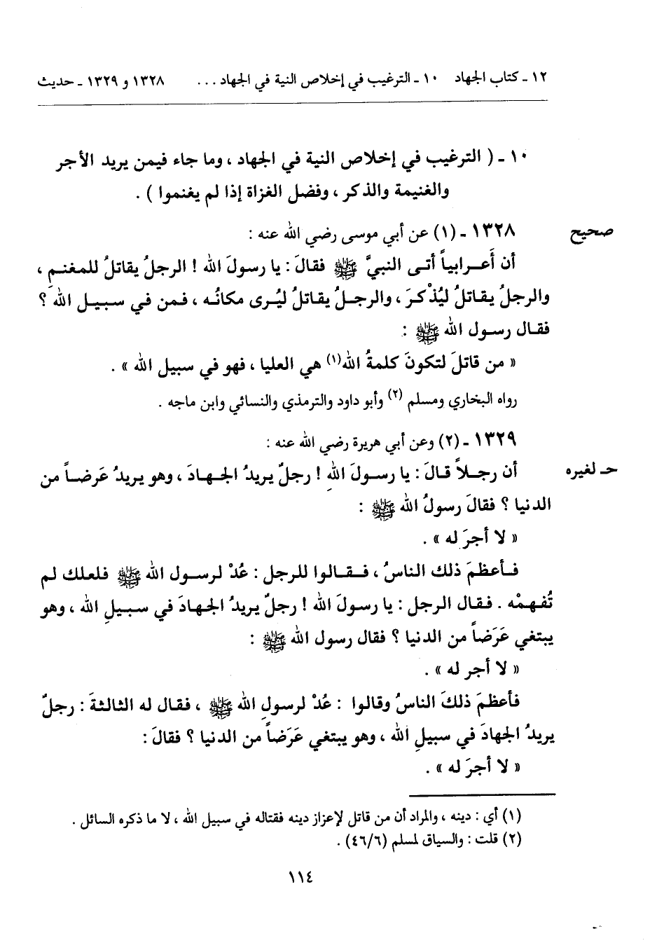 أن رجلاً قالَ: يا رسولَ الله! رجلٌ يريدُ الجهادَ، وهو يريدُ عَرضاً من الدنيا؟ فقالَ رسولُ الله - صَلَّى اللهُ عَلَيْهِ وَسَلَّمَ -: