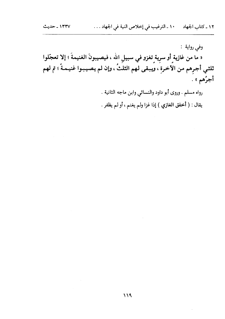 "ما من غازيةٍ أو سرِيةٍ تغزو في سبيلِ الله، فيصيبونَ الغنيمةَ؛ إلا تعجّلوا ثلثي أجرِهم من الآخرةِ، ويبقى لهم الثلثُ، وإن لم يصيبوا غنيمةً؛ تم لهم أجرُهم".