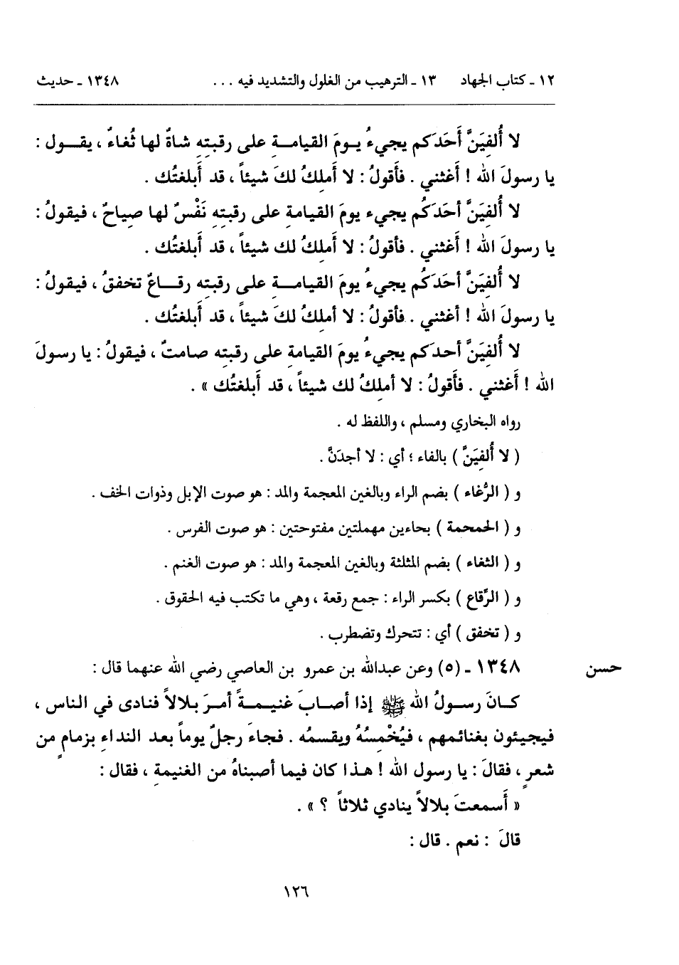 لا أُلفِيَنَّ أَحَدَكم يجيءُ يومَ القيامةِ على رقبتِه شاةٌ لها ثُغاءٌ، يقول: