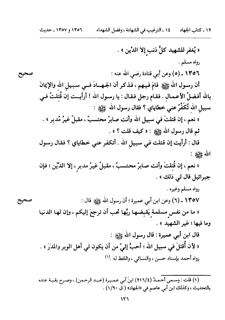 "نعم، إن قُتِلتَ وأنت صابرٌ محتسبٌ، مقبلٌ غيرُ مدبرٍ، إلا الدَّيْن؛ فإن جبرائيل قال لي ذلك".