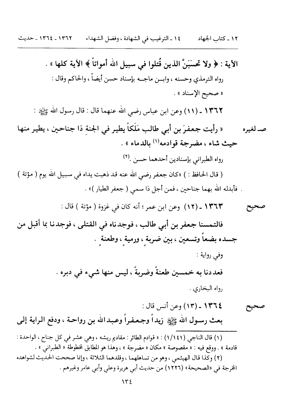 "رأيت جعفرَ بن أبي طالب مَلَكاً يطير في الجنةِ ذا جناحين، يطير منها حيث شاء، مضرجة قوادمه (¬1) بالدماء".