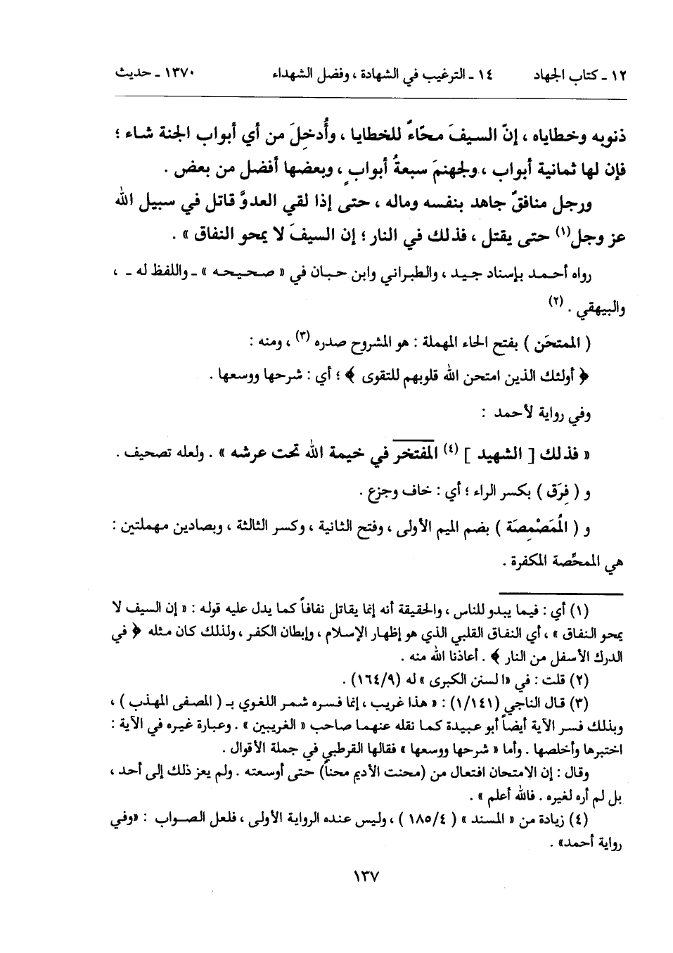 ذنوبه وخطاياه، إنّ السيفَ محّاءٌ للخطايا، وأُدخِلَ من أي أبواب الجنة شاء؛ فإن لها ثمانية أبواب، ولجهنمَ سبعةُ أبوابٍ، وبعضها أفضل من بعض.