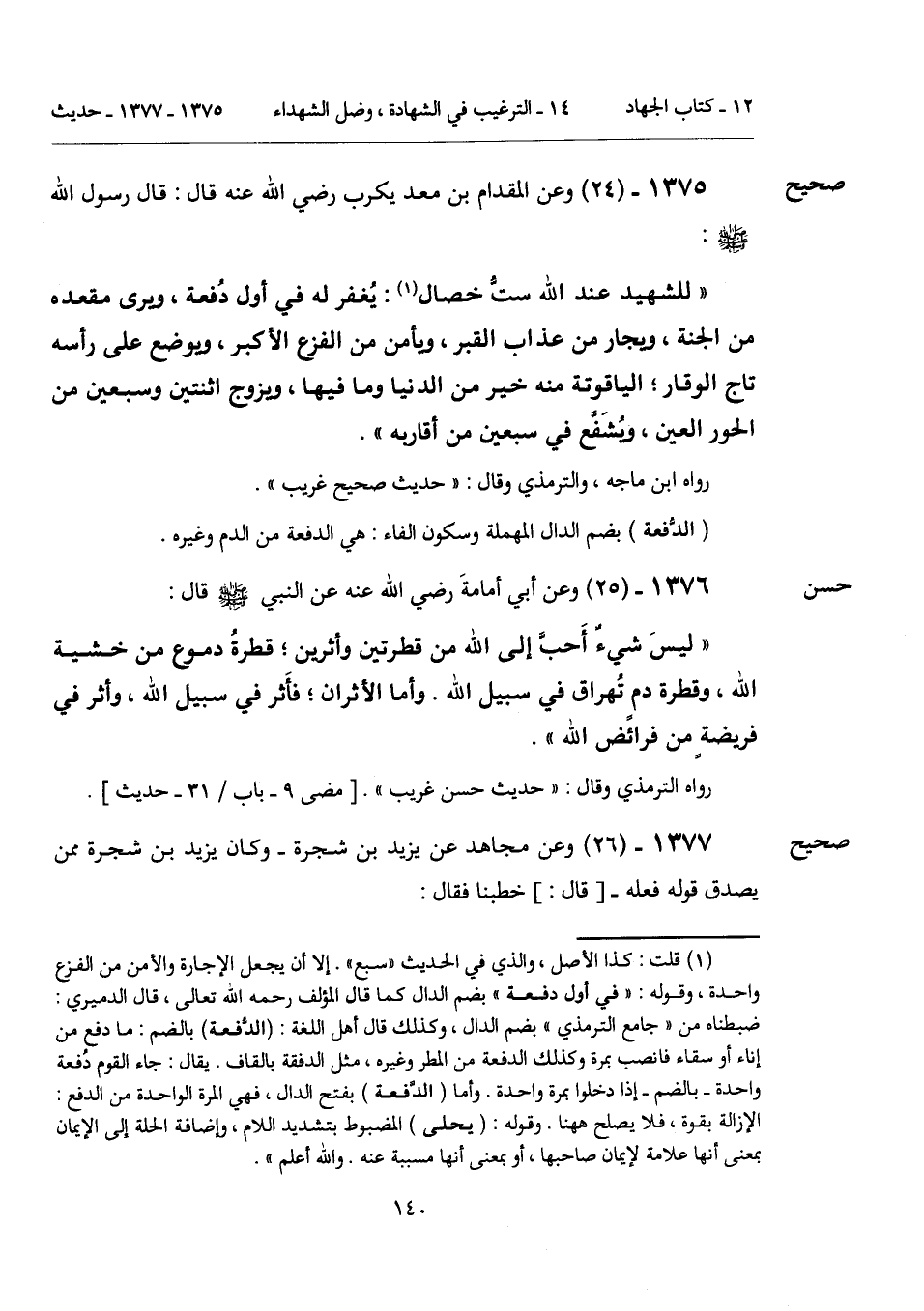 "ليسَ شيءٌ أَحبَّ إلى الله من قطرتين وأثرين؛ قطرةُ دموع من خشية الله، وقطرة دم تُهراق في سبيل الله. وأما الأثران؛ فأَثر في سبيل الله، وأثر في فريضةٍ من فرائض الله".