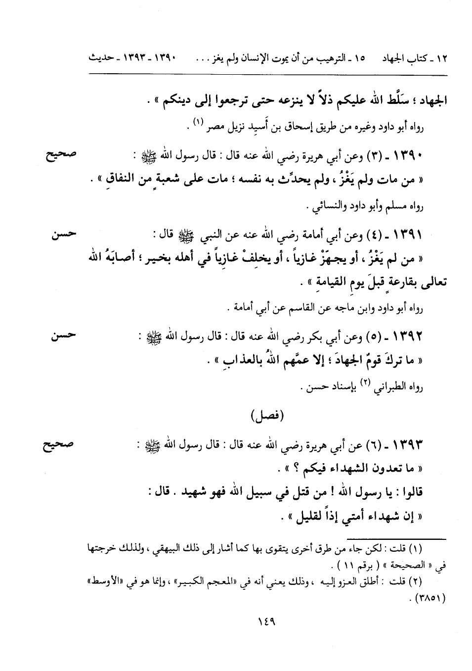 "من مات ولم يَغْزُ، ولم يحدِّث به نفسه؛ مات على شعبةٍ من النفاقِ".