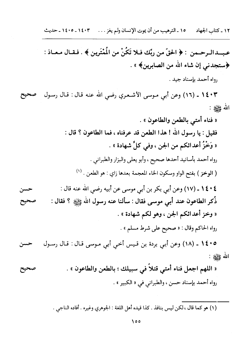 فقيل: يا رسول الله! هذا الطعن قد عرفناه، فما الطاعون؟ قال: