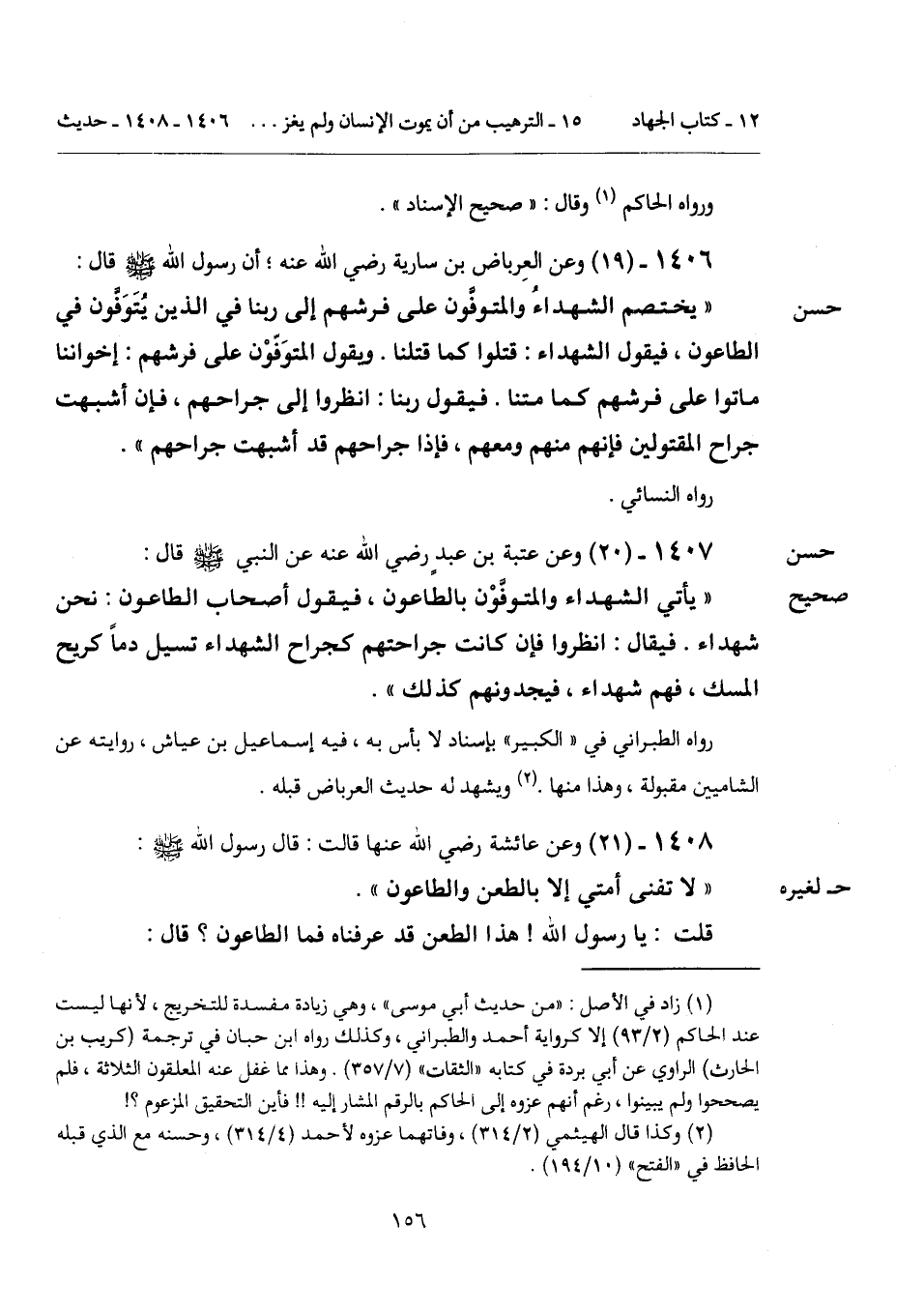 "يختصم الشهداءُ والمتوفَّون على فرشهم إلى ربنا في الذين يُتَوَفَّون في الطاعون، فيقول الشهداء: قتلوا كما قتلنا. ويقول المتوَفّوْن على فرشهم: إخواننا ماتوا على فرشهم كما متنا. فيقول ربنا: انظروا إلى جراحهم، فإن أشبهت جراح المقتولين فإنهم منهم ومعهم، فإذا جراحهم قد أشبهت جراحهم".