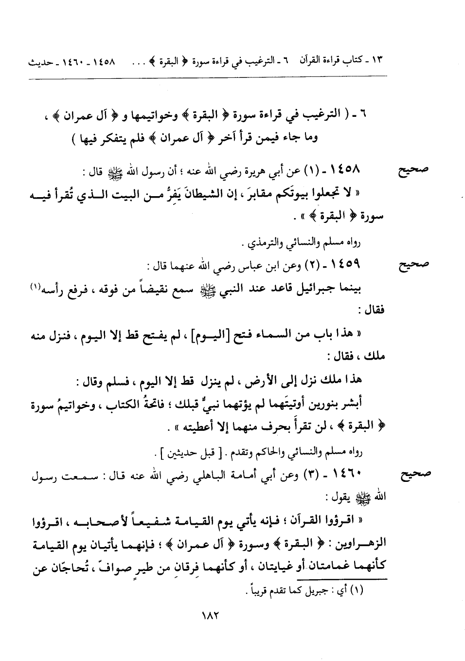 6 - (الترغيب في قراءة سورة {البقرة} وخواتيمها و {آل عمران}، وما جاء فيمن قرأ آخر {آل عمران} فلم يتفكر فيها).