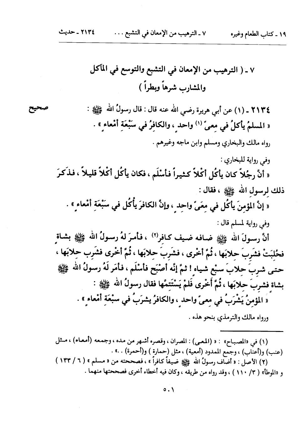 "إنَّ المؤمِنَ يأكُل في مِعَىً واحِدٍ، وإنَّ الكافرَ يأْكُل في سَبْعَةِ أمْعاءٍ".