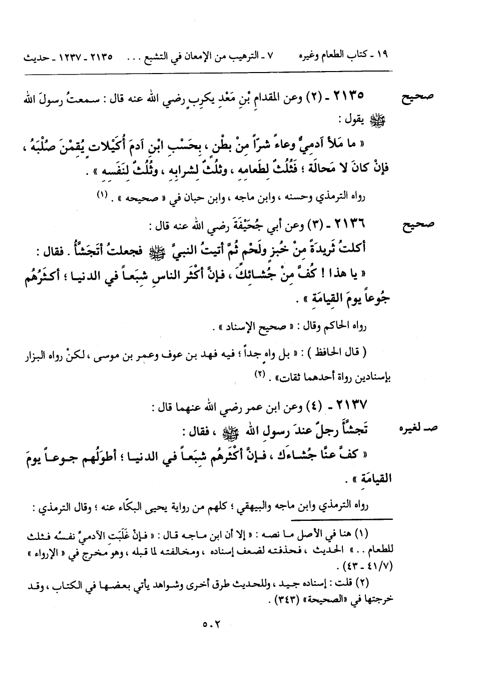 "ما مَلأ آدمِيٌّ وعاءً شرّاً مِنْ بطْنٍ، بِحَسْبِ ابْنِ آدمَ أُكَيْلاتٍ يُقِمْنَ صُلْبَهُ، فإنْ كانَ لا مَحالَة؛ فَثُلُثٌ لِطَعامِهِ، وثلُثٌ لِشرابِهِ، وثُلُثٌ لِنَفَسِهِ".